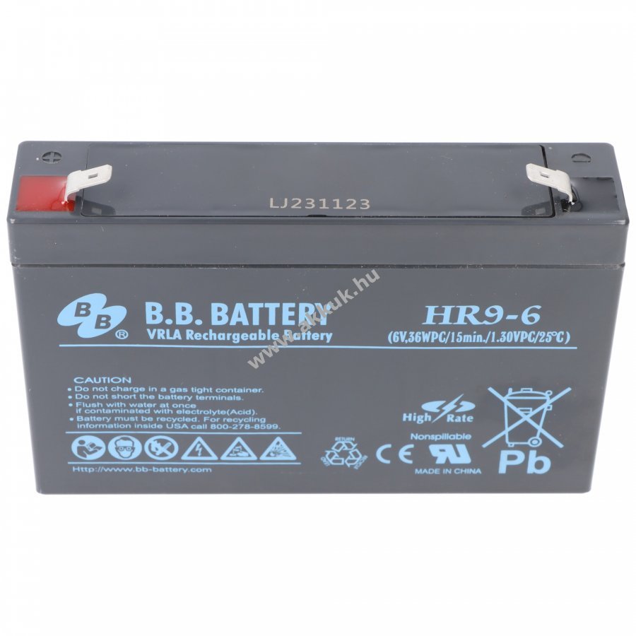6V 9Ah SLA fekete 151mm x 34mm x 94mm 140 gr. B.B Battery 1 év jótállás (további részletek)