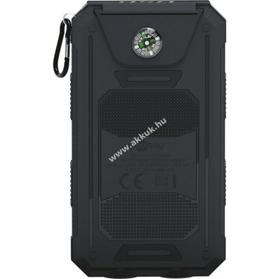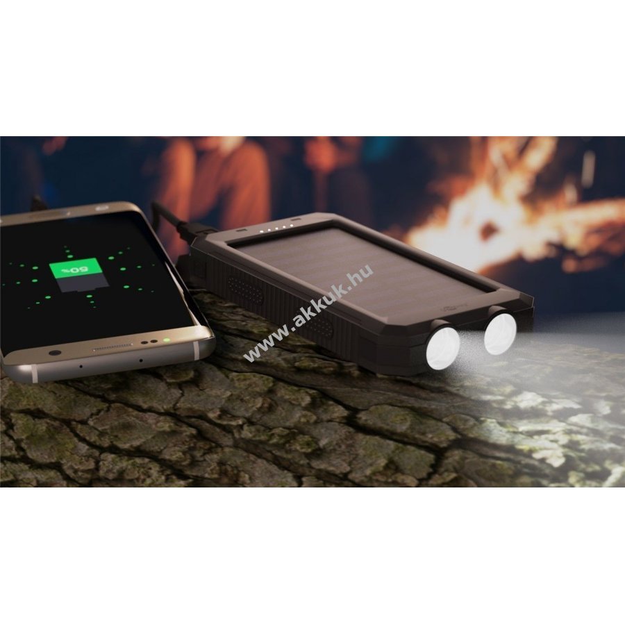 A napelem panel kizárólag kiegészítő töltőként funkcionál, nem alkalmas a powerbank teljes feltöltésére! Goobay víz és ütésálló szolár/napelemes powerbank vésztöltő/külső akku 8000mAh + led lámpa. Jellemzők: -Robosztus design, zseblámpa SOS funkcóval -2db beépített szupererős LED fénnyel -ütés, por és csepp álló (IP45) -csúszásmentes burkolat -2db USB kimenettel mobil -tablet készülékek egyidejű töltéséhez -LED töltésállapot kijelzővel, a hátlapon iránytű található, karabíner a hátizsákra, övre való erősítéshez Tölthető szolárpanelről vagy elektromos hálózatról. Ideális túrázáshoz, utazáshoz. Szolár Töltő áram: 200mA, 500 töltési ciklus, tárolás -10 és +50 fok és páratartalom 10%-80% között, ajándék 30cm micro usb- kábel. A szolár powerbank világításának bekapcsolásához a gomb kétszeri, hirtelen benyomására van szükség.