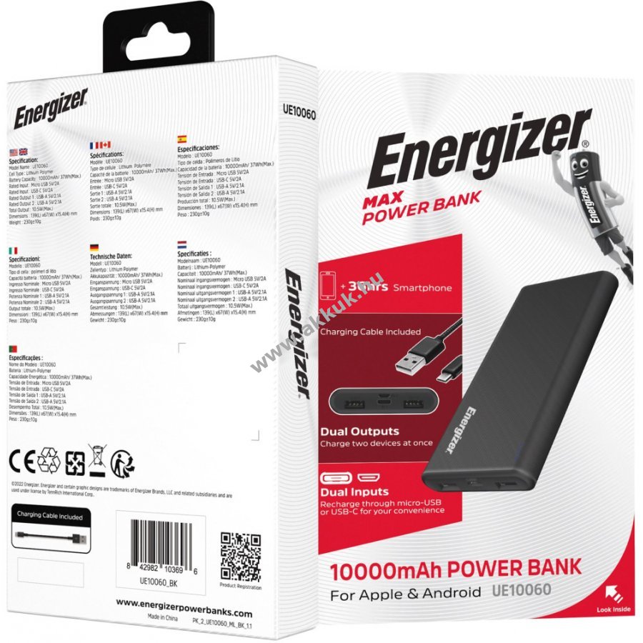5V 10000mAh Li-ion fekete 139mm x 67mm x 15.4mm 230 gr. Energizer Szavatosság (további részletek)