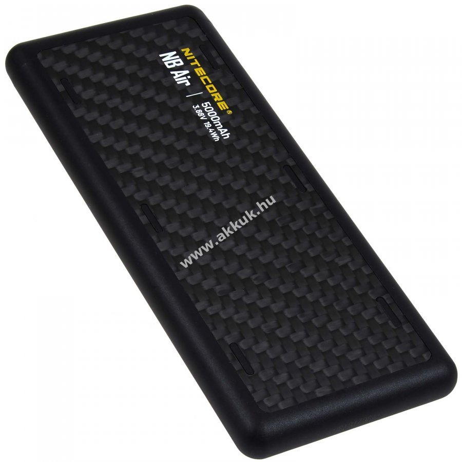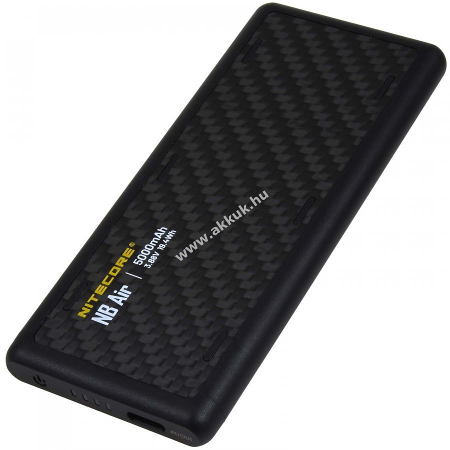 A Nitecore NB Air egy kompakt és strapabíró powerbank, amelynek váza és burkolata karbonból készült. A készülék védelmet nyújt túltöltés, rövidzárlat, mélykisülés, túlfeszültség és túlmelegedés ellen, emellett IPX7 szabvány szerint fröccsenő víz ellen is védett. Kapacitása 5000 mAh (19,4 Wh), súlya mindössze 89 gramm. A töltés és kisütés egyaránt az USB-C porton keresztül történik, amely támogatja a PD (Power Delivery) és QC 3.0 gyorstöltési protokollokat is. A bemeneti teljesítmény 5V–2,4A / 9V–2A (maximum 18W), míg a kimeneti értékek 5V–2,4A / 9V–2A / 12V–1,5A. A töltöttségi állapot a beépített Power Indicator segítségével bármikor ellenőrizhető. A csomag egy Nitecore NB Air powerbankot tartalmaz, töltőkábel nem jár hozzá.