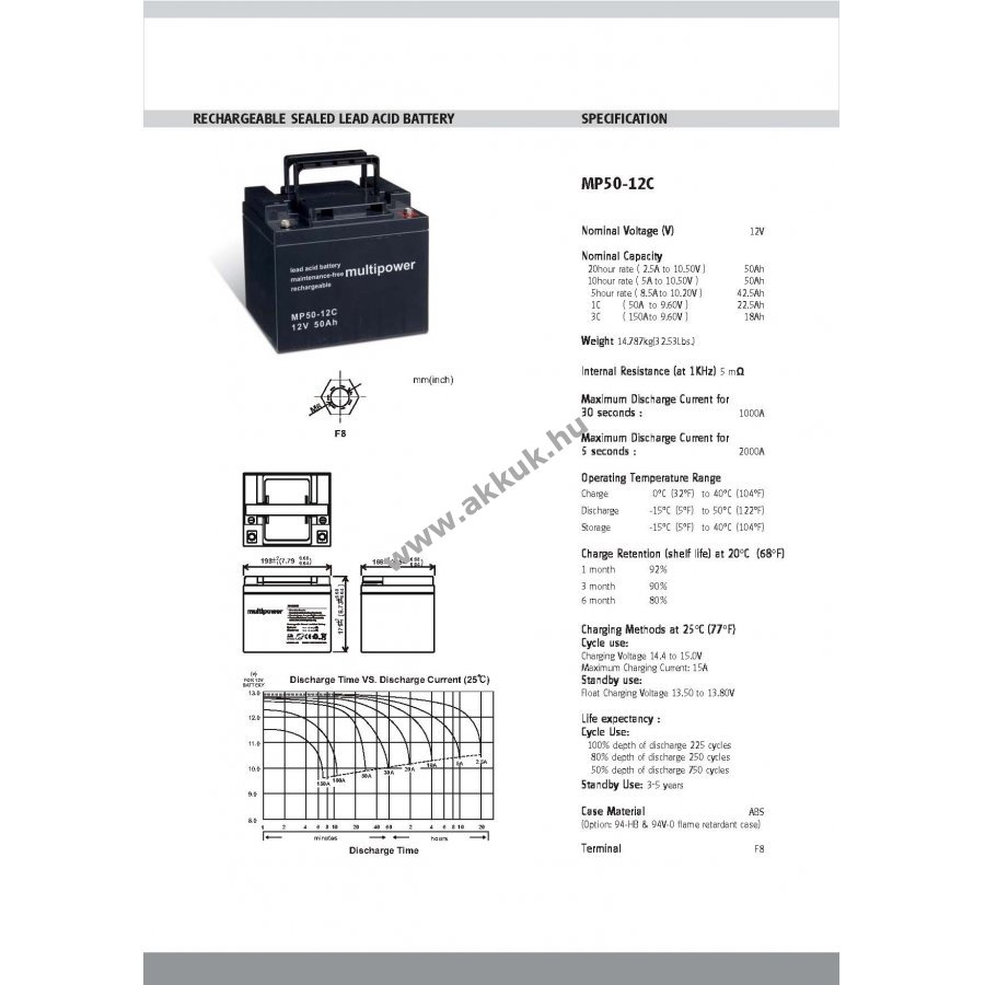 12V 50Ah/600Wh SLA fekete 198mm x 166mm x 171mm 15550 gr. MULTIPOWER 1 év jótállás (további részletek) 4051363767815