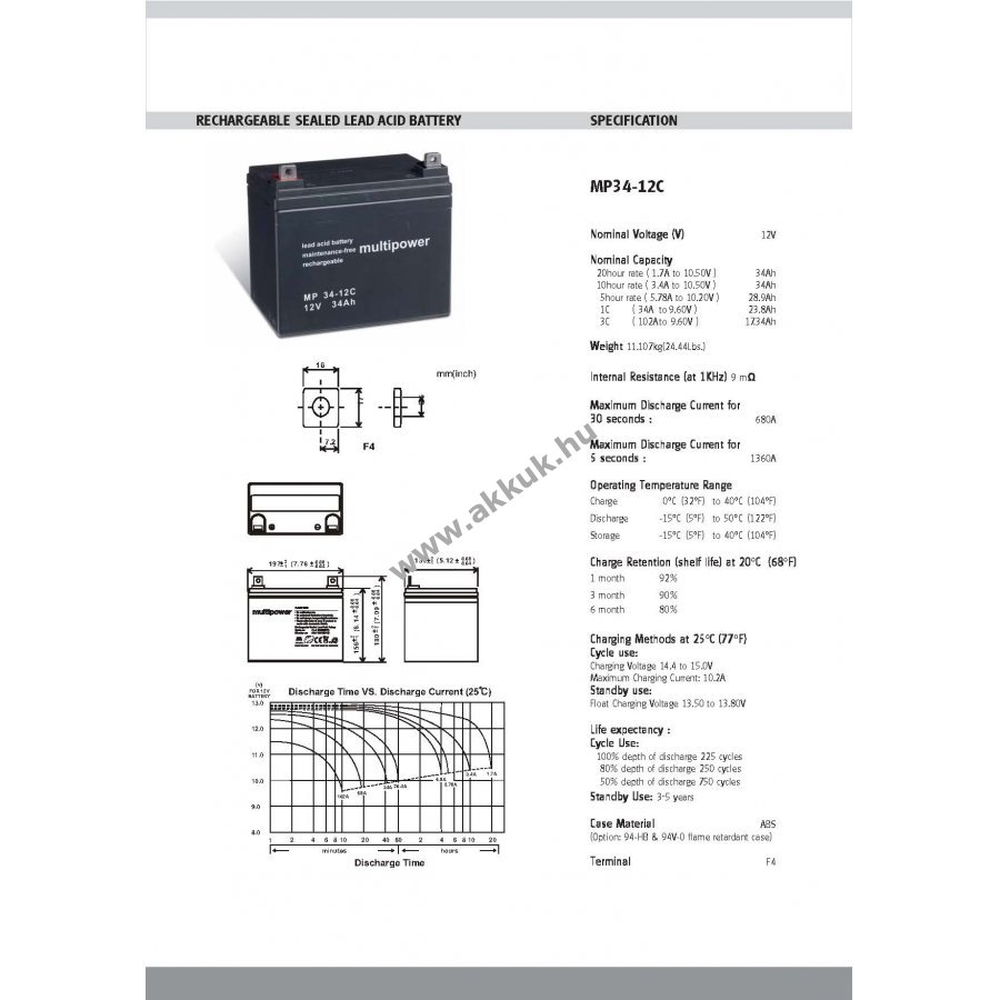 12V 34Ah/408Wh SLA fekete 196mm x 130mm x 180mm 11107 gr. MULTIPOWER 1 év jótállás (további részletek)