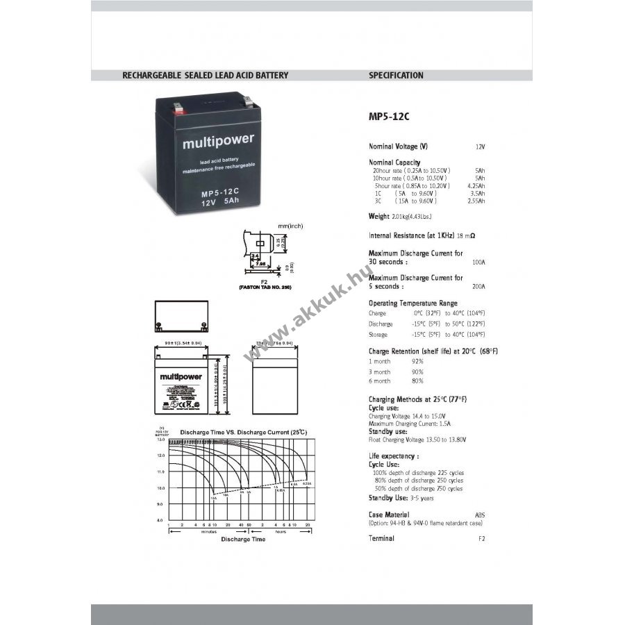 12V 5Ah/60Wh SLA fekete 90mm x 70mm x 108mm 2010 gr. MULTIPOWER 1 év jótállás (további részletek)