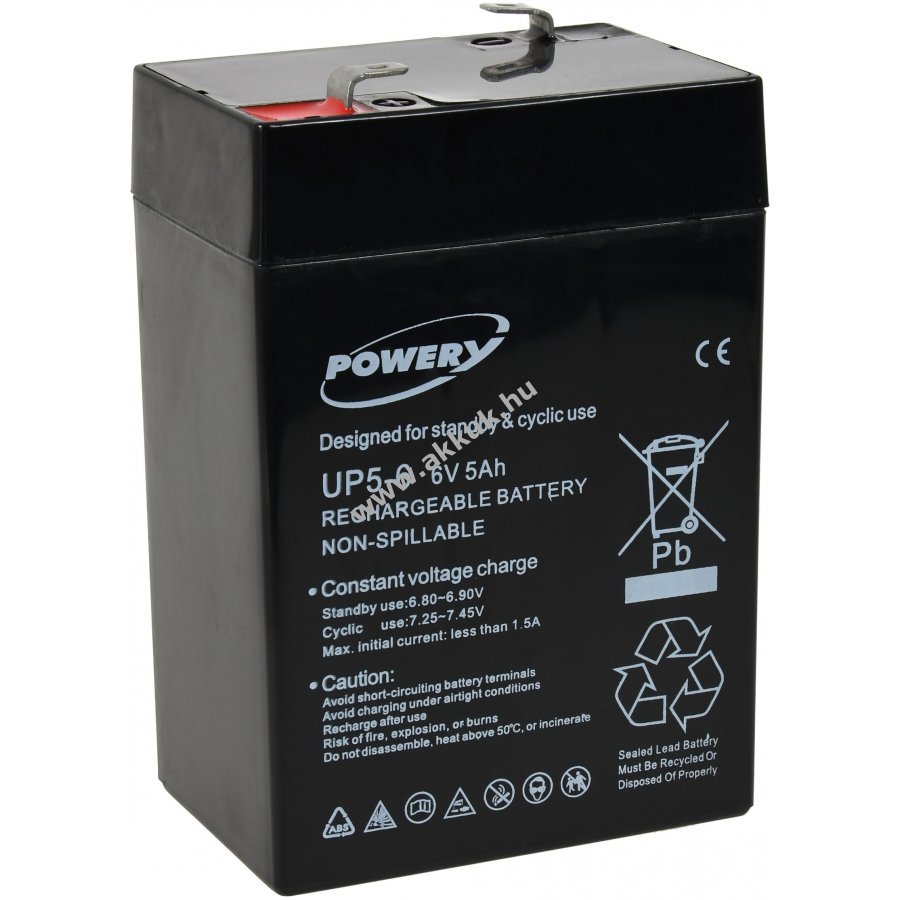 6V 5Ah/27Wh Lead-Acid fekete 70mm x 47mm x 107mm 820 gr. Powery Szavatosság (további részletek) 4051363782269