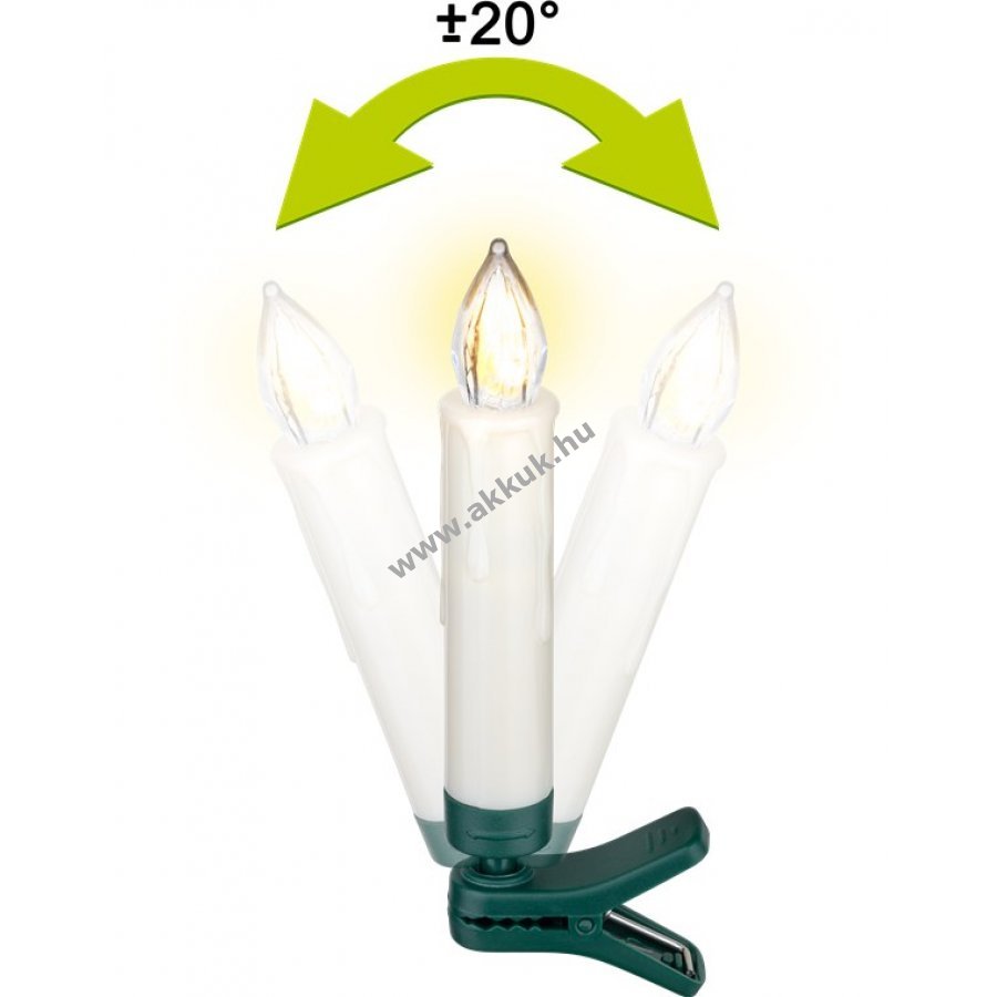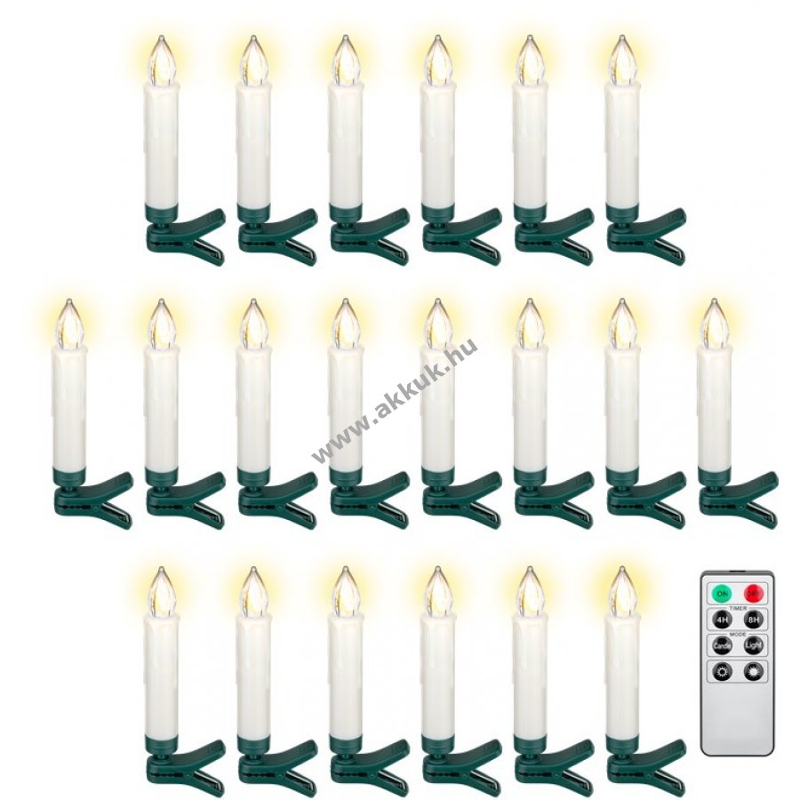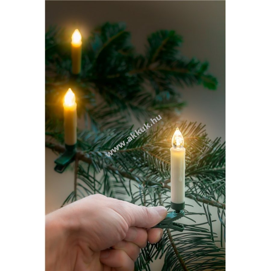 20 darab fehér, vezeték nélküli LED gyertya (egyenként 1,5 x 10 cm) ünnepi karácsonyi világításhoz. Elemmel működik - gyertyák: egyenként 1 x AAA (20 db / készlet, nem tartozék), távirányító: 1 x CR2025 (tartozék) A 8 gombos infravörös távirányítóval kényelmesen vezérelhető a gyertyafény (ON/ OFF, időzítő, fénymódok, 5 fokozatú dimmer), hatótávolsága kb. 5 m. Időzítővel a fény időtartamához: választhatóan 4 vagy 8 órára állítható 2 fénymód: romantikus gyertya villogás vagy folyamatos világítás 5 fényerősségfokozatban az egyéni hangulat érdekében A meleg fehér LED-ekkel ellátott, valódi viasz kinézetű gyertyák beltéri használatra alkalmasak (IP20) A praktikus zöld alligátor klipszek és a gömbcsukló megkönnyítik a gyertyák közvetlen rögzítését a karácsonyfára