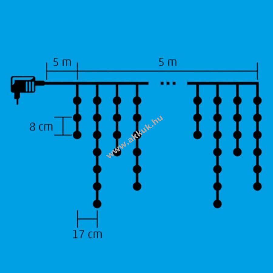 A 150 LED fényes ragyogása és a melegfehér színhőmérséklet egyszerre adja meg az igazi ünnepi érzést. Az 5 méter hosszú függöny fehér vezetéke elegánsan illeszkedik a környezetbe. A 8 program, a memóriás funkció és a választható időzítési módok teszik lehetővé, hogy a fények mindig a kívánt módon világítsanak. A folyamatos üzemmód vagy a 6 óra bekapcsolt és 18 óra kikapcsolt állapotú ismétlődő időzítés kényelmes megoldást kínál. Az KKF 158/WW jégcsap függönyéhez kültéri IP44-es hálózati adapter tartozik, így a fények mindig stabilan és biztonságosan működhetnek.