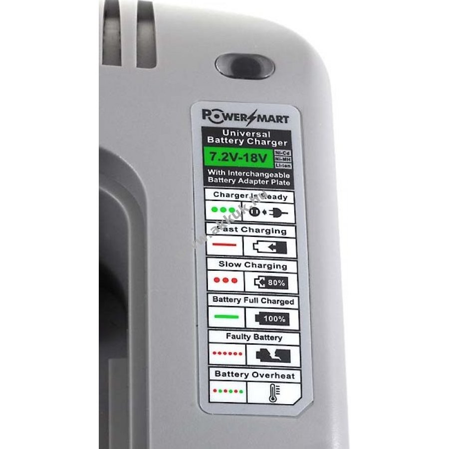 Gyorstöltésre képes asztali Töltő 14,4V feszültségű szerszámgép akkumulátorokhoz Technikai adatok: Bemeneti feszültség: 100-240Volt Kimeneti feszültség: 14,4V (automata szabályozás) + 2db USB 5V kimenet (max. 2,1A kimenetenként) Töltőáram: 1A - 3A között Akkutípusok, amiket tölt: Li-Ion Három fázisú töltés: 1.Elotöltés- 2. Folyamatos gyors áram töltés- 3.Csepegteto töltés Töltésvége lekapacsolás: -Delta U nem eredeti készülék Biztonsági jellemzők: Túlmelegedés elleni védelem, Rövidzárlat elleni védelem Téves polaritás elleni védelem automatikus töltés vége lekapcsolás Hibás akkumulátorok felismerése A csomag tartalma: Asztali Töltő Hálózati kábel USB-Micro USB kábel Használati útmutató