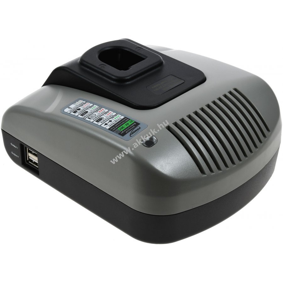 Gyorstöltésre képes asztali Töltő 7,2V - 18V közötti Panasonic NiCd és NiMH típusú szerszámgép akkumulátorokhoz Technikai adatok: Bemeneti feszültség: 100-240Volt Kimeneti feszültség: 7,2V-18V (automata szabályozás) + 2db USB 5V kimenet (max. 2,1A kimenetenként) Töltőáram: 1A - 3A között Akkutípusok, amiket tölt: NiCd, NiMH, Három fázisú töltés: 1.Elotöltés- 2. Folyamatos gyors áram töltés- 3.Csepegteto töltés Töltésvége lekapacsolás: -Delta U nem eredeti készülék Biztonsági jellemzők: Túlmelegedés elleni védelem, Rövidzárlat elleni védelem Téves polaritás elleni védelem automatikus töltés vége lekapcsolás Hibás akkumulátorok felismerése A csomag tartalma: Asztali Töltő Hálózati kábel USB-Micro USB kábel Használati útmutató