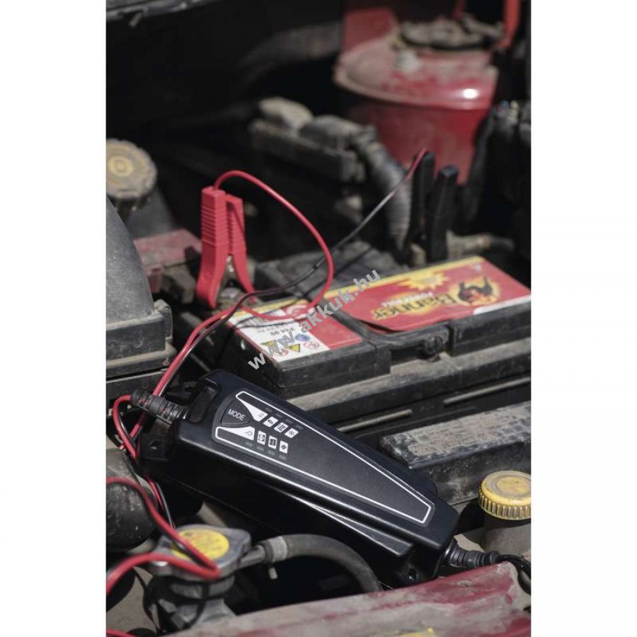 Gépkocsik, motorkerékpárok, tartalék akkumulátorok, ólom-sav akkumulátor, WET (savas), MF (karbantartás-mentes), VRLA, AGM és GEL akkumulátorok töltésére. Muszaki jellemzők: Bemenőfeszültség 220-240 V AC 50 Hz, Kimenőáram max. 4 A Töltőfeszültség 7,3 V,14,4 V,14,7 V Töltőáram 0,8A +,- 10 %,10 % +,- 3,0 A,4,0 A +,- 10 % Akkumulátortípusok Az összes 12 V-os ólmos-savas akkumulátor (folyadék elektrolit - WET, karbantartásmentes MF MF, Ca,Ca, AGM és zselés) Akkumulátor kapacitás 6 V 1,2Ah-14Ah 12V: 1,2 Ah-120Ah Töltő típus 7 lépcsos, teljesen automatikus töltési ciklus Áramfelvétel a hálózatról 600 mA (teljes Töltőáram mellett) Visszaáramlás miatti kisülés * <1 mA (<1 Ah havonta) Ingadozás ** <5 % Hatásfok > 80 % Készenléti üzemmód <1 W Fenntartó (trickle) töltési áram: 50-150 mA Hibás vagy alkalmatlan akkumulátor értékeléséhez szükséges feszültségszint <3,7 V vagy > 15 V Védelem a rövidzárlat, túlterhelés, túlmelegedés és a fordított polaritás ellen. Automatikus töltés kikapcsolás Fenntartó üzemmód Töltőkábel 1,8 m - kivezetések (+ vörös, - fekete) Hálózati kábel 1.8 m Védettség IP65 Környezeti hőmérséklet-tartomány 0°C - 40°C (magas hőmérsékleteken automatikusan csökken a kimeneti teljesítmény) Méretek 194 × 64,3 × 47 mm (H × Mé × Ma) Tömeg 526 g *) A visszafolyó áram miatt bekövetkező kisülést az okozza, hogy áram folyik keresztül a csatlakoztatott Töltőn, amikor az le van választva a tápfeszültségrol. Az EE04A típusú EMOS Töltőnek nagyon kicsi a visszárama. Havonta <1Ah (1 mA,h). **) Nagyon fontos a Töltőfeszültség és a Töltőáram minosége. Az eros áramingadozás felhevíti az akkumulátort és felgyorsítja a pozitív elektróda öregedését. Az eros feszültségingadozás zavarhatja az akkumulátorhoz kapcsolódó többi készüléket. Az EMOS EE04A jó minoségu feszültséget és áramot biztosít alacsony ripple hatás mellett. Az EE04A típusú EMOS Töltő egy 7 lépcsos (Diagnosztika, Regenerálás, I-es töltési fokozat, II-es töltési fokozat, Abszorbció, I-es karbantartási töltési fokozat, II-es karbantartási töltési fokozat), teljesen automatikus, üzemmód kapcsolós Töltőkészülék 6 V , 12 V-os ólmos-savas akkumulátorokhoz. Olyan sokoldalú Töltő, amely megfelelő töltési üzemmódokkal rendelkezik a kicsi és a nagy akkumulátorokhoz is az 1,2 Ah - 120 Ah tartományban. Ilyen akkumulátorokat használhatnak például gépkocsikban, lakókocsikban, motorcsónakokban, motorbiciklikben, quadokban, jet skikben. A készülék felhasználható tartalék tápforrásként is. Az akkumulátorok különféle típusúak lehetnek, így nedvesek (folyadék elektrolitosak), zselések (az elválasztó lemezekbe abszorbeált zselé elektrolittal) vagy AGM típusúak (abszorbens üveg elválasztó lemezekkel). Az autóakkumulátor Töltő még hidegben is fel tudja tölteni az akkumulátorokat. Az élvonalbeli technológia felhasználásával újra közel eredeti kapacitásuk 100%-ára lehet feltölteni az akkumulátorokat. A készülék képes a szulfátos akkumulátorok regenerálására. Diagnosztizálja, majd feltölti a lemerült akkumulátorokat. A készülékkel végezheto csepptöltés és szivárgó töltés is, ezáltal növelve az akkumulátor élettartamát és kituno teljesítményt biztosítva. A Töltőt alacsony visszáram-fogyasztás jellemzi. Töltési fázisok 1. lépés - Diagnosztika: A Töltő megvizsgálja a csatlakoztatott akkumulátort (detektálja a feszültséget). Meghatározza az akkumulátor állapotát. 2. lépés - Regenerálás: Ha az erosen lemerült akkumulátor feszültsége nagyobb mint 7,5 V, a készülék kis áramimpulzussal kezdi a töltést, hogy regenerálja a hozzá kapcsolt akkumulátort. Amint a feszültség eléri a 10,5 V-ot, a Töltő átvált az I-es üzemmódba. Ha az akkumulátor feszültsége már a töltés elkezdésekor magasabb, mint 10,5 V, a Töltő átugorja a regenerálási eljárást és az I-es töltési üzemmódra vált át. 3. lépés - I-es töltési fokozat: A leheto legmagasabb, 4 A-es árammal tölt az akkumulátor kapacitásának kb. 80 %-áig, amíg a feszültség el nem éri a 12,8 V értéket. 4. lépés - II-es töltési fokozat: Kisebb erosségu, 3 A-es árammal végzett töltés addig, amíg az akkumulátor feszültsége el nem éri a 14,1 V értéket. 5. lépés - Abszorbció: Alacsony erosségu, 0,8 A-es árammal végzett töltés addig, amíg a feszültség 14,1 V-ról 14,4 V-ra (hideg környezetben 14,7 V-ra) no. Az akkumulátor ebben a fokozatban majdnem 100%-ra Töltődik. 6. lépés - I-es karbantartási töltési fokozat: Folyamatos Töltőfeszültség biztosításával maximális szinten tartja az akkumulátor feszültségét. 7. lépés - II-es karbantartási töltési fokozat: Az akkumulátor töltésének fenntartása a kapacitás 95-100%-án. A Töltő felügyeli az akkumulátor feszültségét, és szükség esetén ad egy impulzust, hogy teljesen feltöltött állapotban tartsa az akkumulátort.
