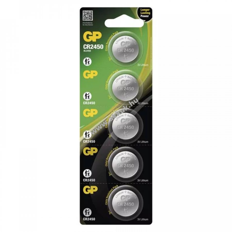 kémiai összetétel: lítium, kategória/sorozat: Lithium, típus: GP CR2450, feszültség: 3 V, tölthető: nem, kapacitás: 590 mAh, méretek: 24,5 × 5,0 mm, súly: 6,6 g, üzemi hőmérséklet: -20 °C és +60 °C, max. tárolási idő: 10 év, mennyiség szerinti ár: 1 db ára, értékesítési csomagolás: 5 db, bliszter, garancia-időszak: 2 év