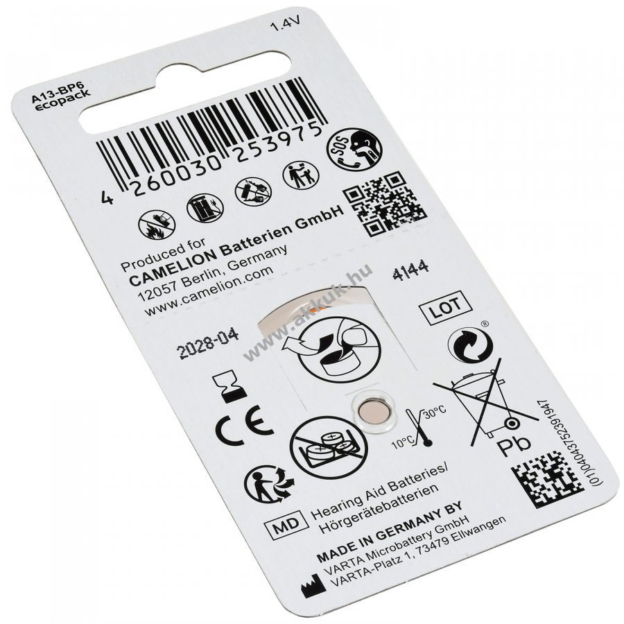 Camelion hallókészülék elem A13 ZL13 PR754 DA13 PR48 AE13 V13AT 13AE 6db/csom.