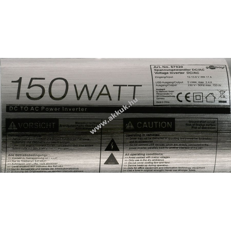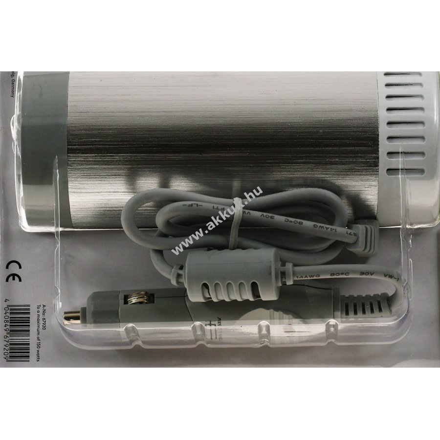 A 230 V-os váltakozó feszültség pl. 150W energiafogyasztással rendelkező notebook tápegységek mobil működtetésére használják. Műszaki adatok: Bemeneti feszültség: 12 V (DC) Kimeneti feszültség: 230 V (AC) Kimeneti teljesítmény: 150W (max.) Kimenet (típus): Védőérintkezős csatlakozóaljzat (F típus, CEE 7/7) USB Kimeneti feszültség: 5 V USB - max. Teljesítmény: 2.4A bemenet: szivargyújtó csatlakoztatására