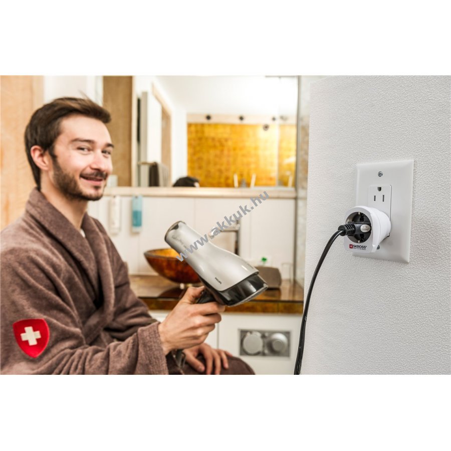 Az országadapter ideális utazóknak és szállodáknak hogy európai készülékeket csatlakoztassanak az USA hálózatához 2 és 3 pólusú csatlakozóval. Alkalmas nagy teljesítményű eszközökhöz mint laptop és hajszárító. Teljesítmény 100 V - 1500 W vagy 250 V - 3750 W. Az adapter nem feszültségátalakító.