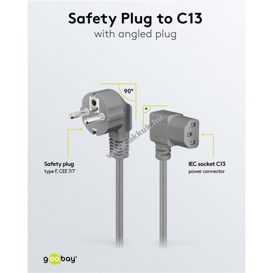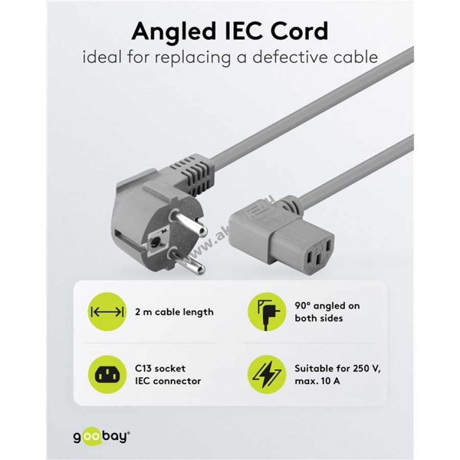 Egyetemes tápkábel 90 fokos nikkelezett érintkezős hálózati csatlakozóval és 90 fokos C13 hidegcsatlakozóval 2 m hosszban 3x0,75 mm2 keresztmetszettel