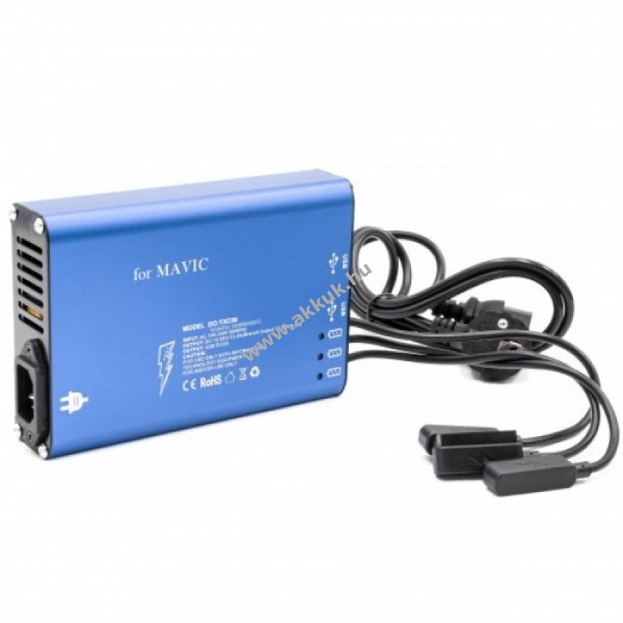 Töltési idő: 60 - 80 perc Ezzel a töltővel egyszerre 3db DJI Mavic Pro akkumulátort, a távirányítót és egy okostelefont tölthet. A távirányító és az okostelefon töltése a 2 USB porton keresztül történik 3 LED töltésjelzővel piros: betöltés zöld: teljesen feltöltve Túlfeszültség, túláram, túlmelegedés és túlterhelés elleni védelemmel Kábelhossz a töltőtől az akkumulátorig vagy a távirányítóig: 21.4 cm