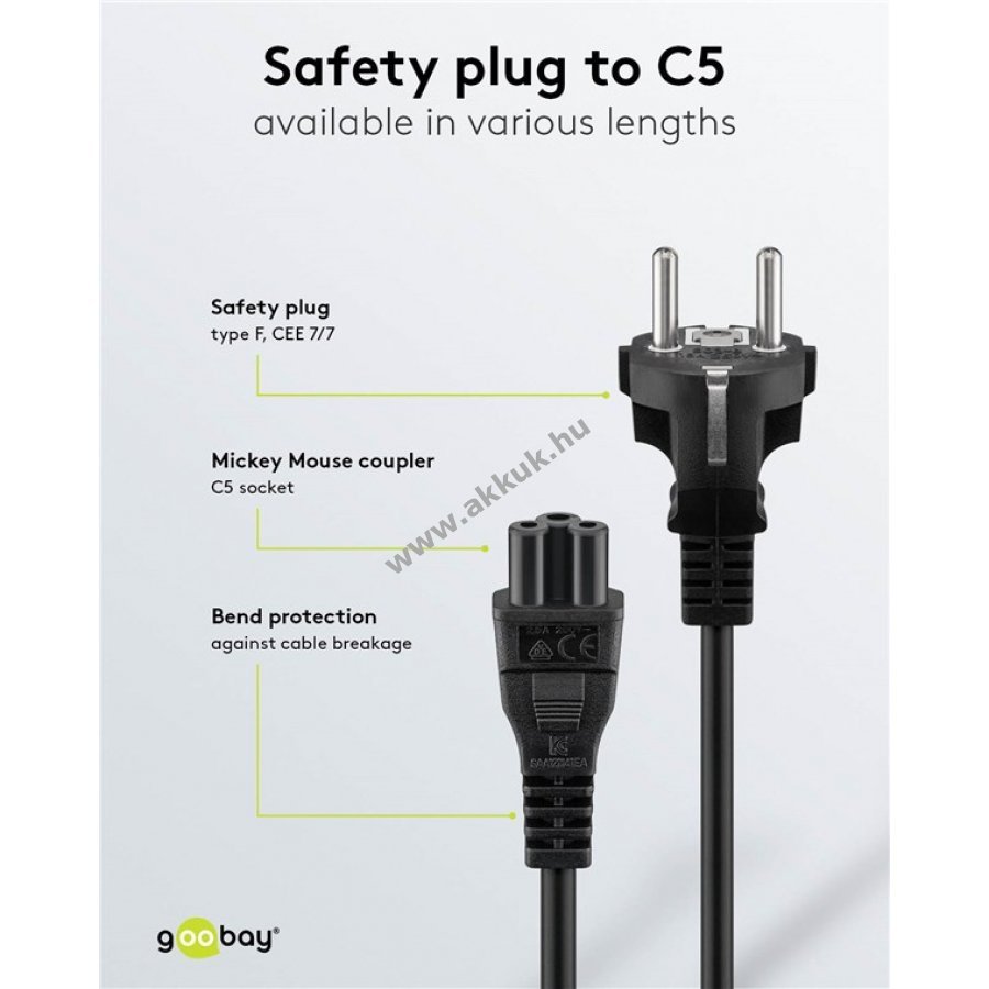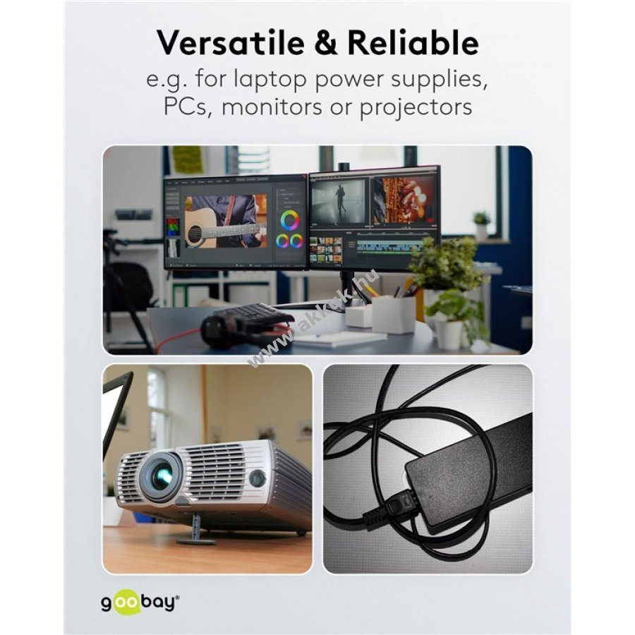 Csere hálózati kábel hibás tápkábelek helyett laptophoz PC monitor vagy projektor készülékekhez Kompatibilis különféle audio és irodai eszközökkel mint mélynyomó erősítő keverő nyomtató vagy iratmegsemmisítő 3 eres kábel kis készülék aljzattal IT és háztartási gépekhez Alkalmas készülékek földeléses csatlakoztatására max 2,5 A terhelhetőséggel Rugalmas PVC burkolat közepes mechanikai igénybevételhez semleges fekete szín
