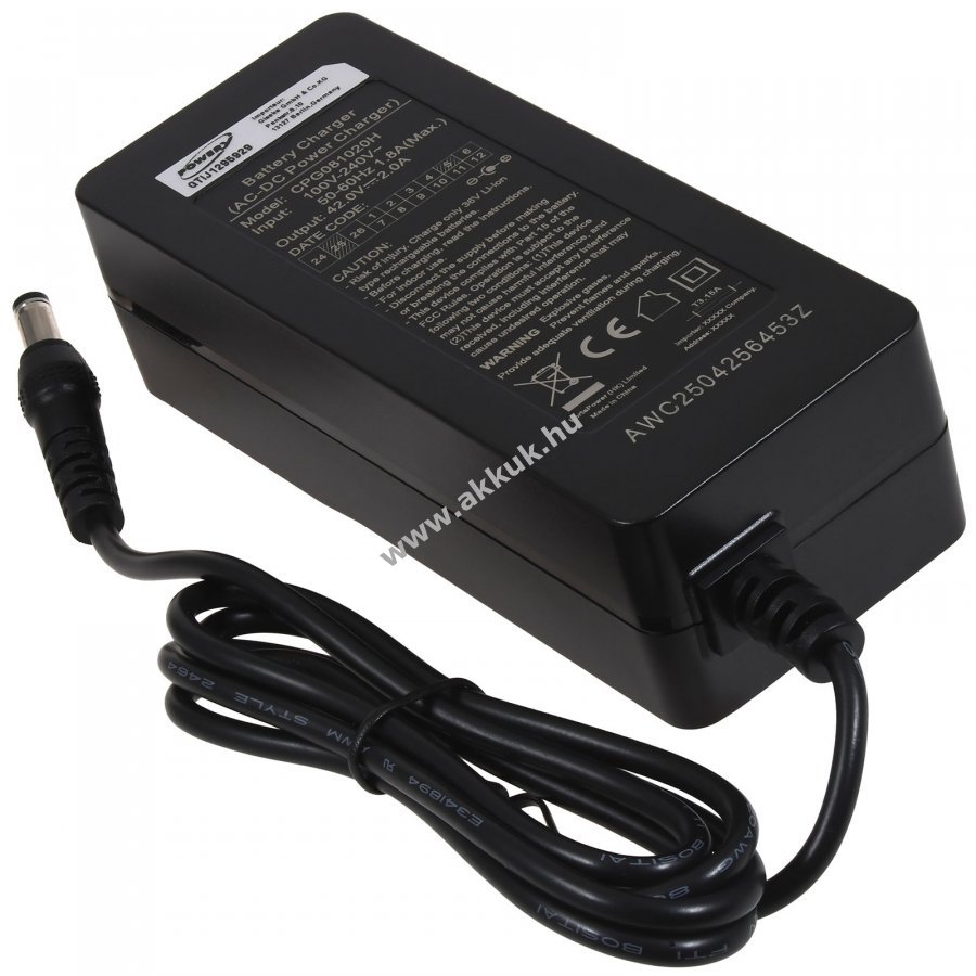 Műszaki adatok: Bemeneti feszültség: 100V-240V Kimeneti feszültség: 42V DC Kimeneti áram: 1,35A Névleges teljesítmény: max. 60W További termékinformációk: - Csatlakozó méretei: 2,1mm (belül) és 5,5mm (kívül) - LED-es töltési állapotjelzővel - Rövidzárlatvédelemmel - Szín: Fekete - Méretek: 114,65mm x 58,90mm x 31,60mm - Súly: 280g.