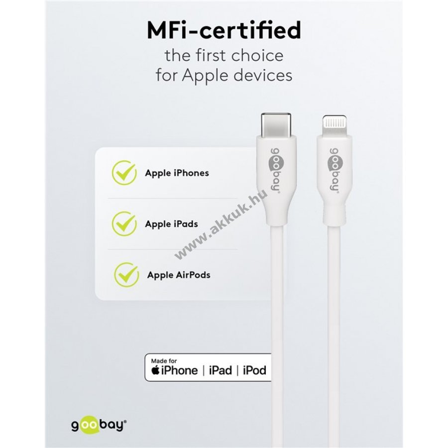 Kompatibilis számos Apple iPhone és iPad modellel valamint AirPods fülhallgatókkal. Támogatja a Power Delivery és az Apple gyors töltési módot akár 27 W teljesítménnyel. Hi-Speed adatátvitel akár 480 Mbit/s sebességgel. USB-C és Lightning csatlakozóval adatátvitelre és töltésre egyaránt alkalmas. Rövid 0,5 m-es kábel ideális kisebb távolságok áthidalására például autóban vagy teherautóban. Mindkét csatlakozón törésgátló található, így védi a kábelt a sérülésektől és jól használható védőtokok mellett is. Az USB-C csatlakozó univerzális és megfelel a legújabb szabványoknak.