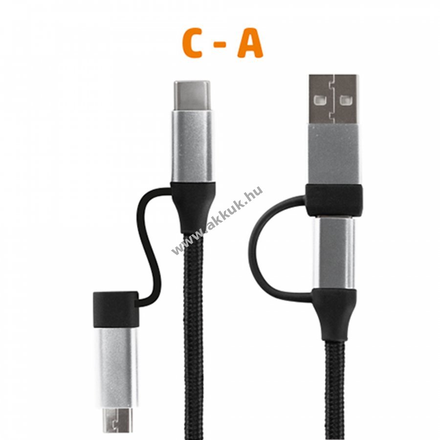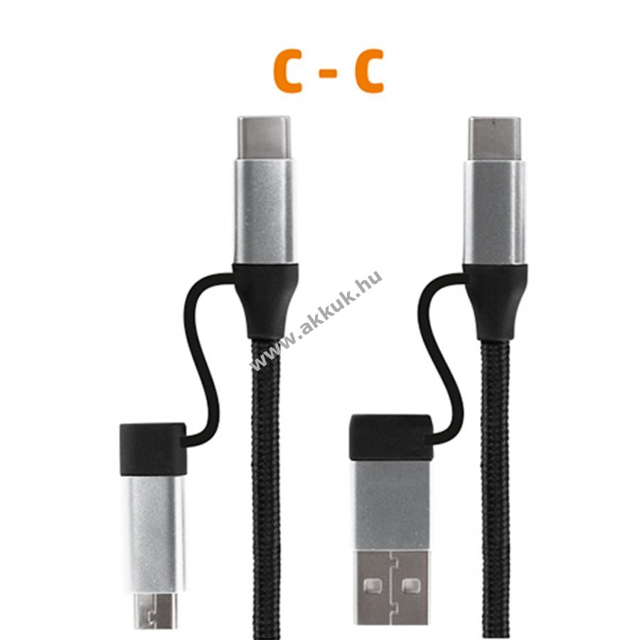 4in1: 4 önálló kábelt helyettesít - C-C / C-microUSB / C-USB A / USB A-microUSB - telefon, notebook és más termékekhez - normál, QC és PD gyorstöltéshez is - exkluzív dizájn és minőség igényes, hajlékony, nejlon szövésű vezeték - a fizikai behatásoknak jól ellenálló köpeny és fém dugók - kevésbé hajlamos gabalyodásra - általában adatkábelként is funkcionál (max. 480 Mps) kb. 1,5 m hosszú vezetékkel - USB 2.0 / 20 V / 3 A / 60 Wmax.