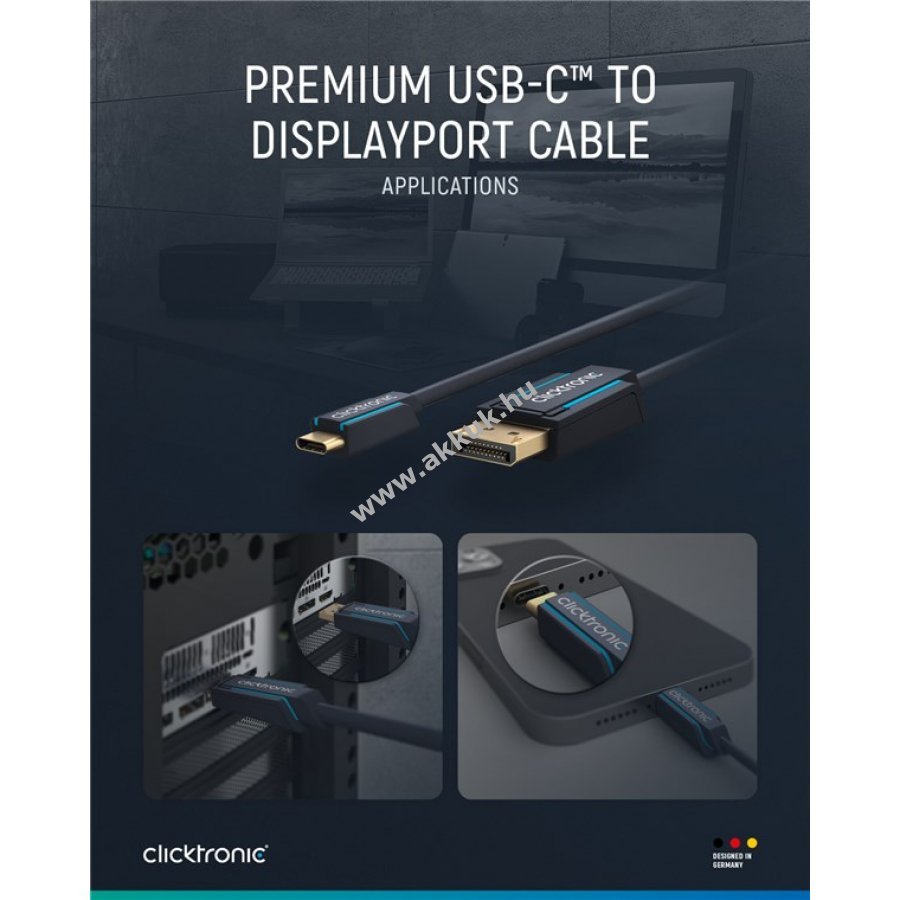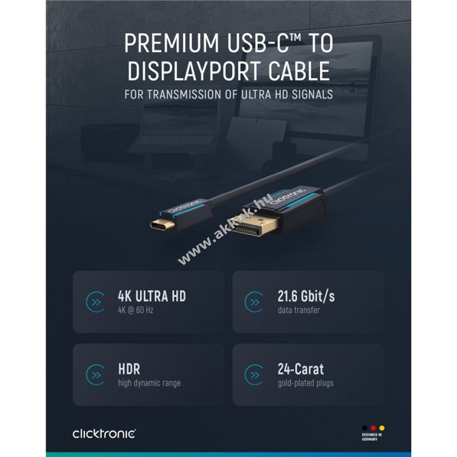 A Clicktronic USB-C DisplayPort adapterkábel tartós és stabil kapcsolatot biztosít. 10 év garanciával rendelkezik. A háromrészes PVC és ABS csatlakozóvédelem megakadályozza a kábel sérülését hirtelen húzás esetén. A 24 karátos aranyozott csatlakozók és tiszta réz vezetők gyors adatátvitelt garantálnak. A strapabíró PVC külső borítás védi a kábelt és biztosítja a stabil kapcsolatot.