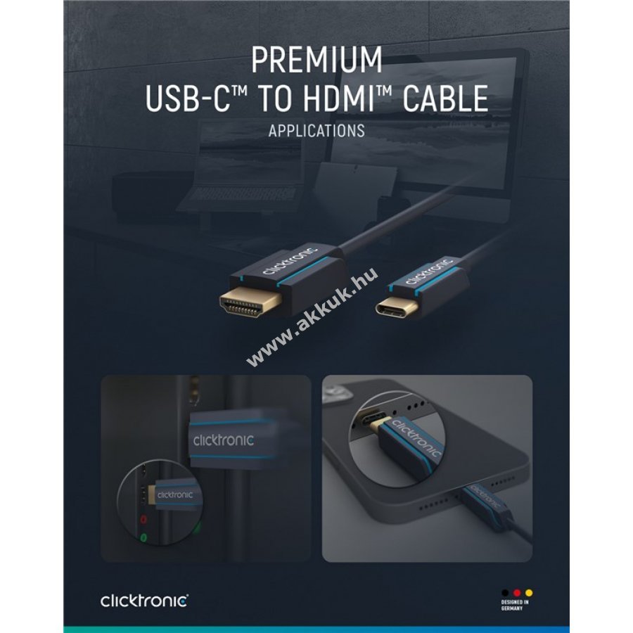 Clicktronic minőségi USB-C HDMI adapterkábel hosszú élettartammal és stabilitással. 10 év garancia a kábelekre. Különleges háromrészes csatlakozó PVC és ABS elemekből védi a kábelt a sérülésektől. 24 karátos aranyozott HDMI csatlakozó alacsony átvitel ellenállással. Tiszta réz vezetők és kétszeres árnyékolás biztosítja a gyors adatátvitelt és kiváló jelminőséget. Ultra HD jelátvitel 4K 60 Hz felbontásig. Integrált Ethernet-csatorna a hálózati jel továbbításához. Rugalmas törésvédelem és tartós PVC külső burkolat védi a kábelt.