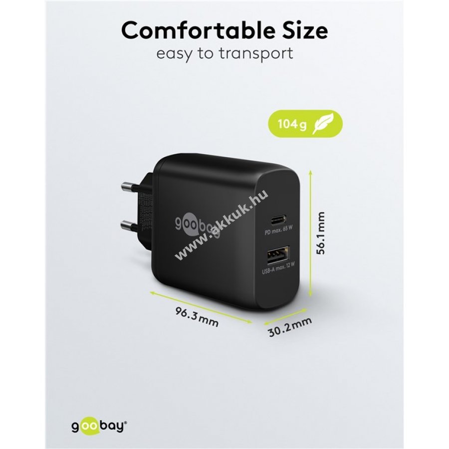 Kompakt és könnyű hálózati töltő akár 65 W teljesítménnyel alkalmas laptopok és mobil eszközök gyors és megbízható töltésére.