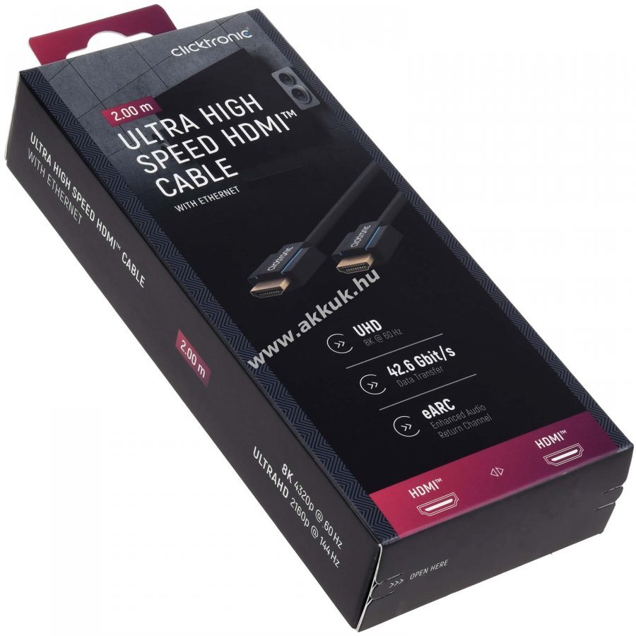 Prémium kábel , 1x HDMI dugó \<> 1x HDMI dugó , 2,0 m , UHD 8K @ 60 Hz A hivatalos HDMI Premium tanúsítvánnyal rendelkező Clicktronic 8K HDMI kábel garantálja a legjobb minőséget. A legújabb HDMI szabvány a hibátlan film- és játékélményhez ideális a filmek szerelmeseinek és a játékosoknak. HDMI csatlakozókábel UHD jelátvitelhez akár 8K @ 50/60 Hz (4320p) és 4K @ 120 Hz (2160p) esetén. G-Sync és FreeSync kompatibilis a sebességelőnyért a játékban, akár 48 Gbit/s maximális átviteli sebességgel a tömörítetlen 8K videókhoz HDR-rel. A 24 karátos aranyozott HDMI-csatlakozók és a fejlett technológia garantálja a hibátlan jelminőséget a képátvitel késleltetése nélkül az optimális játékélmény érdekében. Tiszta rézvezetők és háromszoros árnyékolás a tiszta hang és a borotvaéles videó- és képminőség érdekében.