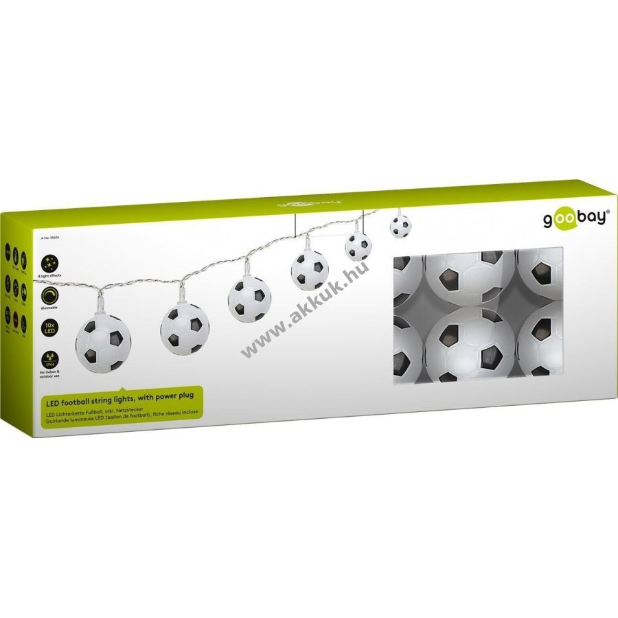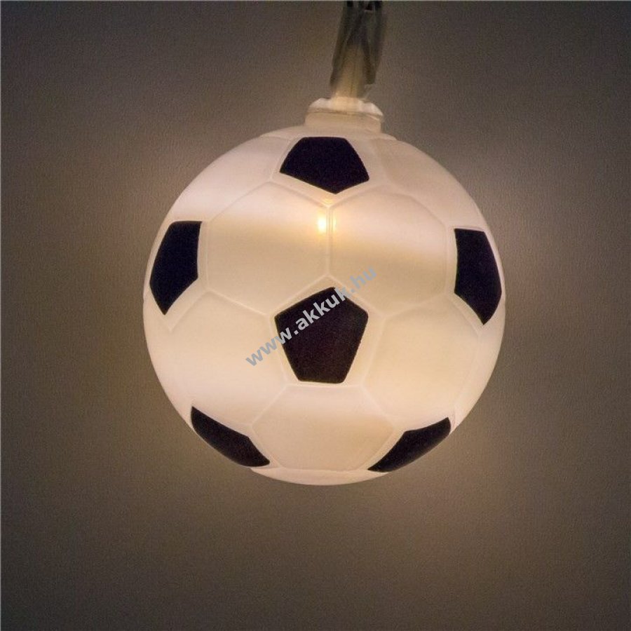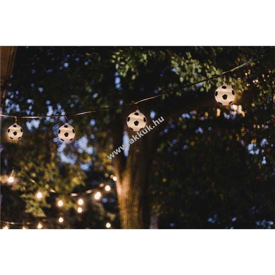 LED fényfuzér focilabdás, futball labdás mintával. Tökéletes világítás futball eseményhez. Fényfuzér 10 meleg fehér LED lámpával (átmérője 5 cm mindegyik) futballlabda formában, 8 különbözo fénykombináció kínál változatosságot: Kombináció , hullámos , szekvenciális fény , zoom be , ki , villogó , lassú elhalványul , glitter , folyamatos fény. Alkalmas beltéri és kültéri használatra (IP44) a tápkábel kb. 2,5 m, a teljes hossz kb. 5,2 m, távolság a lámpák között 30 cm.