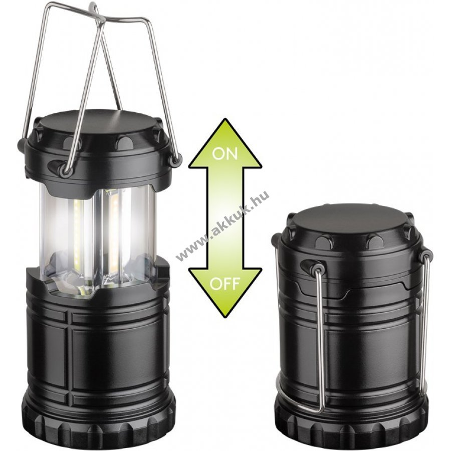 kempinglámpa nagyon fényes 3W-os COB LED-ekkel 250 lm fényerővel és 4m-es hatótávolsággal. a kempinglámpa lámpafeje kihúzható a fénykúp fokozatmentes beállításához praktikus, összecsukható fém fogantyúval a hordozáshoz és a felakasztáshoz sátorlámpaként is használható, és ideális szabadidős, kempingezéshez, fesztiválokhoz, túrázáshoz, horgászathoz és közúti segítségnyújtáshoz nem tartalmaz üvegből készült alkatrészeket, így nincs törésveszély a szabadtéri tevékenységek során elemmel működik: (LR03, nem tartozék), fényidő kb. 5 óra folyamatos használat mellett. méretek: magasság 9,5 cm, kihúzva 13,5 cm, átmérő 6,8 cm