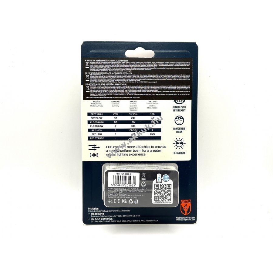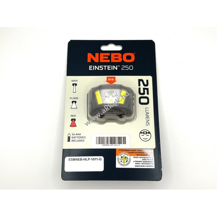 NEBO EINSTEIN 250 fejlámpa, 250lm-30lm, 106 m, 7 funkció, IP44, 3 x AAA elem, állítható fényerő, power memory funkció, direct to red funckió, 180°-ban dönthető, reflektor magas fényerő (250 lumen):3,5 óra/106méter, reflektor alacsony fényerő (30 lumen):24óra/42m, C.O.B fehér fény (80 lumen):9óra/13m, C.O.B alacsony fényerő (7 lumen):34óra/2m, piros fény magas fényerő(3 lumen):10,5óra/1m, piros fény alacsony fényerő(1 lumen):40óra/0,25m, piros fény stroboszkóp 42 óra