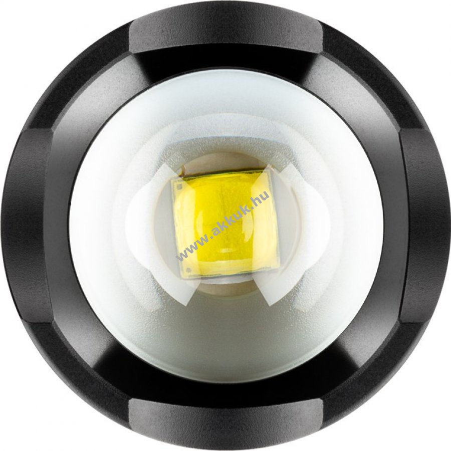 Akkumulátoros zseblámpa szuperfényes Cree XHP50.2 nagy teljesítményű LED-ekkel (20 W) Az 1500 lumenes fénynek köszönhetően a tárgyak akár 300m távolságból is megvilágíthatók. Az IPX7 szabvány megvédi a zseblámpát a heves esőzés és a rövid ideig tartó vízbe merülés ellen. A korrózióálló alumínium ház és a praktikus csuklópánt teszi ezt a kisméretű, kézreálló lámpát tökéletessé a szabadtéri tevékenységekhez. Egy gombnyomással 3 különböző fénymód állítható be: 100 % fény, 20 % fény és SOS. Zoom funkció: fókuszgyűrűvel ellátott lámpafej a fénysugár fokozatmentes beállításához A LED-es zseblámpa elemmel működik (6db AA, nem tartozék).