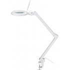 A fényerő és a fény színe 6 fokozatban állítható külön érintőképernyőkön keresztül, max. 800 lm, melegfehértől a nappali világosságig (3500 - 6500 K) A lencsefej akár 100°-kal dönthető és 250°-kal elforgatható, a 127 mm-es lencseátmérő harmonikus LED-gyűrűs megvilágítást eredményez. A gyorskioldónak köszönhetően egyszerűen és szerszámmentesen cserélhető a 3 dioptriás, 1,75x nagyítású szabványos üveglencse (védősapkával együtt). A nagyító lámpa csuklós karja beépített kábelvezetéssel rugalmas 700 mm-es munkasugarat biztosít Ideálisan alkalmas asztali nagyítónak, kézműves lámpának, íróasztal-, rajz- vagy olvasólámpának is Az asztali nagyítós lámpa felcsíptethető része legfeljebb 50 mm vastagságú asztallaphoz alkalmas