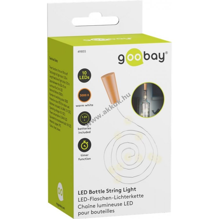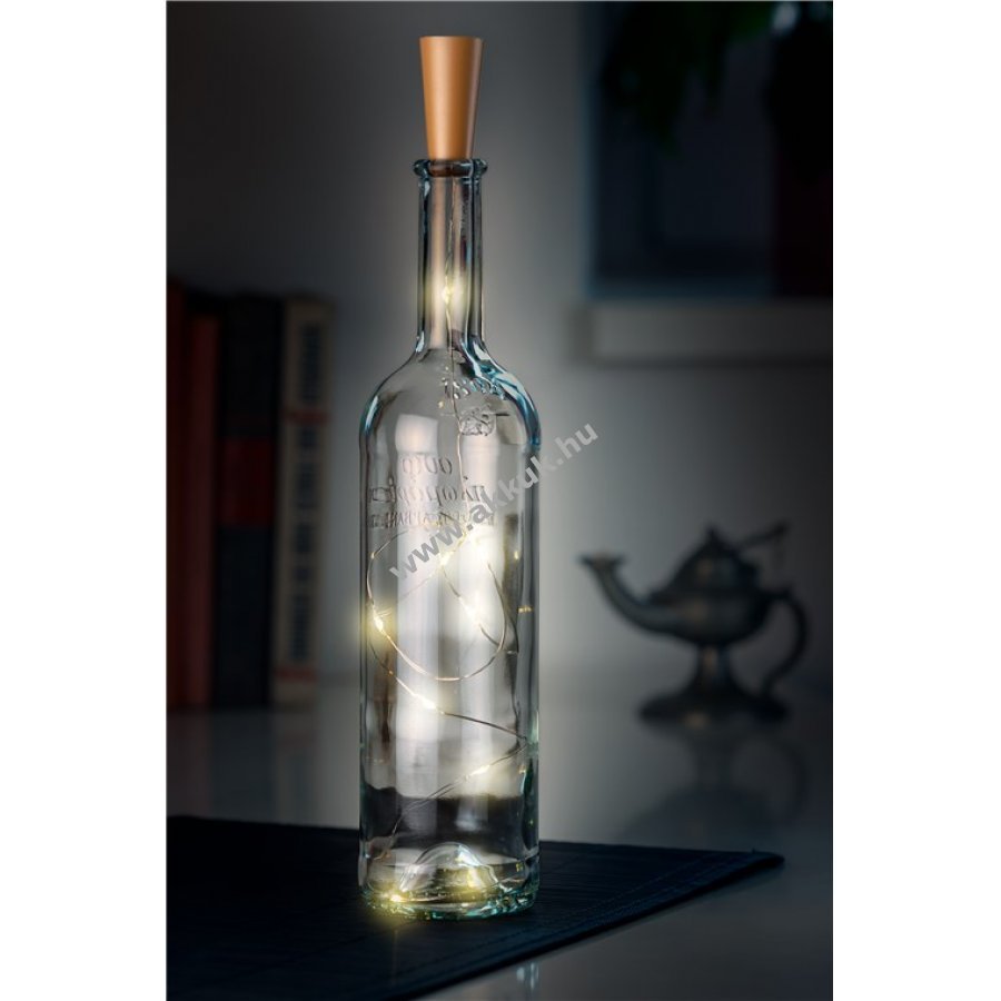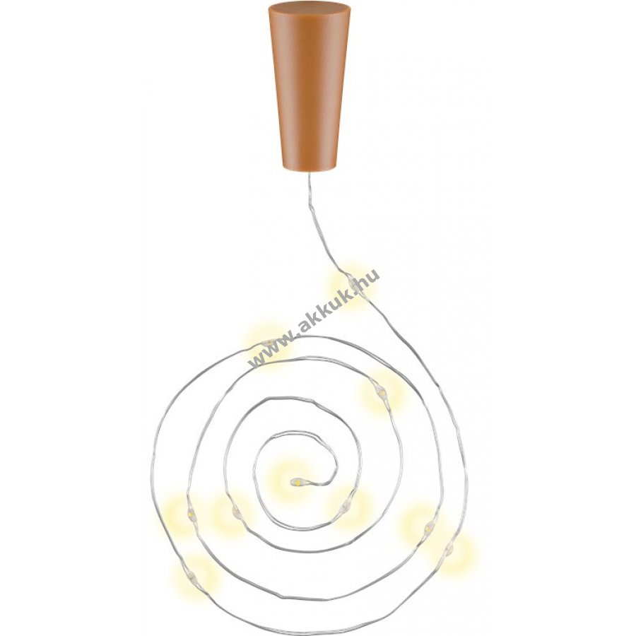hajlékony vezeték és 10 meleg fehér LED időzítő funkcióval - 6 óra be / 18 óra kikapcsolva különösen üvegpalackok atmoszférikus és dekoratív megvilágítására szolgál beltéri használatra alkalmas (IP20) elemmel működtethető (3 x LR44, a csomag része) teljes hossz: kb. 1,00 m A LED-ek 10 cm-re vannak egymástól