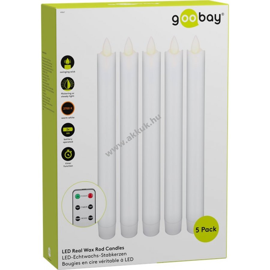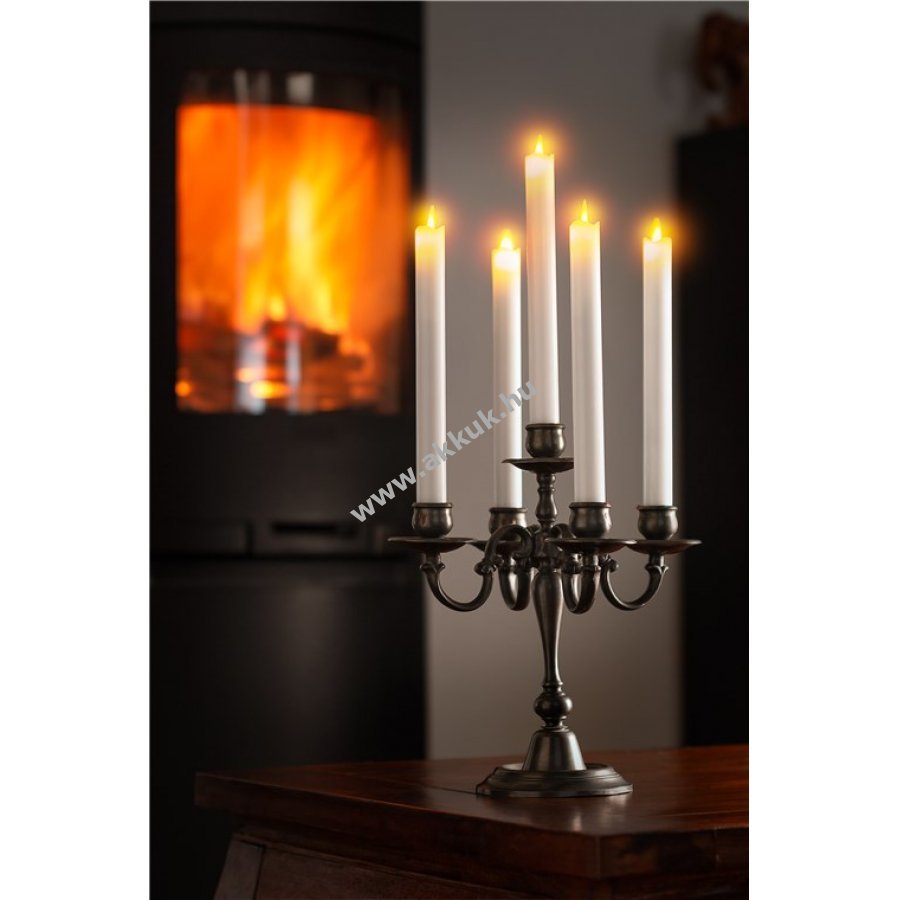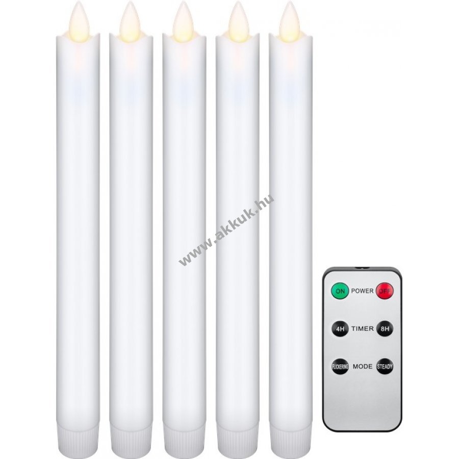 5 db fehér LED gyertya (mindegyik 2,1 x 24 cm) egyedülálló lánghatás a valódi viaszból készült mozgó kanócnak és gyertyahéjnak köszönhetően - nehéz megkülönböztetni a valódi gyertyáktól 6 gombos távvezérlővel - BE / KI, 4/8 óra időzítővel, villogó és folyamatos fényvel meleg gyertyafény - egyszerű, elegáns és különösen biztonságos olyan helyeken használható, ahol a valódi gyertyák túl veszélyesek vagy nem engedélyezettek akkumulátorral működtethető - gyertyák: 2db AA (10 db / készlet, nem tartozék), távirányító: 1 x CR2025 (tartozék) Megjegyzés: ne tegye ki magas hőmérsékletnek és erős napfénynek, különben a gyertyák megolvadnak