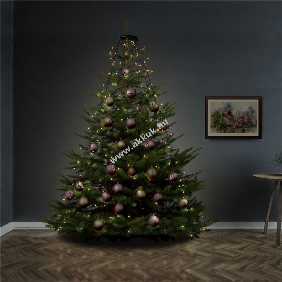 A LED karácsonyfaháló 1,40-1,80 m-es fenyőfákhoz ideális. Hangulatos világítást biztosít fenyőknek és dekorációként esküvőkre szilveszterre születésnapi bulikra és kertekbe. 8 világítóágban 25 LED található 1,5 m hosszú áganként 6 cm LED-távolsággal. Az időzítő 6 óra működés 18 óra szünet memóriával. 8 világítási mód: kombináció hullámok szekvencia lassú pislákolás gyors váltás lassú tompítás villogás állandó fény. A háló sötétzöld kábelből és 8,5 cm átmérőjű karikából áll. IP44 védelem beltéri és kültéri használatra. A teljes hossz 6,5 m ebből a tápkábel 5 m.