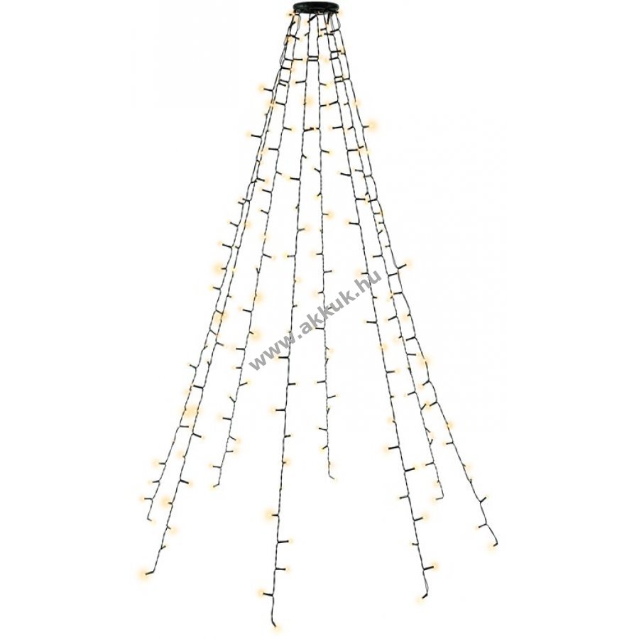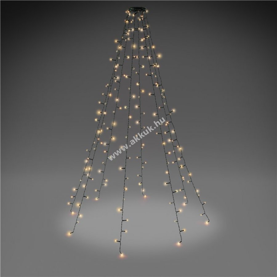 A gyűrűs fénylánc 1.40-1.80m magas karácsonyfához alkalmas. Alkalmas hangulatvilágításként fenyőfákhoz, de ideális dekorációként is esküvők, szilveszter, születésnapi partik és a kert díszítésére is A zsinórok rugalmasan elhelyezhetők a fán, és a hagyományos tündérfényekhez képest leegyszerűsítik a díszítés folyamatát. Adapterdugó 8 üzemmóddal (kombináció, hullámokban, szekvenciális, lassú izzás, gyors váltás, lassú fényerő, pislákolás, folyamatos fény), időzítő 6 óra bekapcsolás/18 óra kikapcsolás, memória funkcióval. Fényháló 8 darab, egyenként 25 LED-es fényfüzérrel, a fényfüzér hossza 1,5m, a LED-ek közötti távolság 6cm. IP44 védettségi osztálynak köszönhetően beltéri és kültéri használatra egyaránt alkalmas. Teljes hossza: 6,5m, ebből tápkábel 5m, sötétzöld kábel és sötétzöld gyűrű 11cm átmérővelvel.