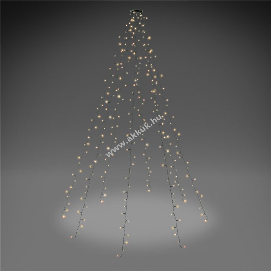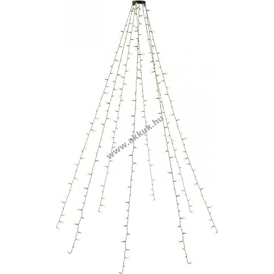 A gyűrűs fénylánc 1.60-2.40m magas karácsonyfához alkalmas. Alkalmas hangulatvilágításként fenyőfákhoz, de ideális dekorációként is esküvők, szilveszter, születésnapi partik és a kert díszítésére is A zsinórok rugalmasan elhelyezhetők a fán, és a hagyományos tündérfényekhez képest leegyszerűsítik a díszítés folyamatát. Adapterdugó 8 üzemmóddal (kombináció, hullámokban, szekvenciális, lassú izzás, gyors váltás, lassú fényerő, pislákolás, folyamatos fény), időzítő 6 óra bekapcsolás/18 óra kikapcsolás, memória funkcióval. Fényháló 8 darab, egyenként 35 LED-es fényfüzérrel, a fényfüzér hossza 2m, a LED-ek közötti távolság 5.7cm. IP44 védettségi osztálynak köszönhetően beltéri és kültéri használatra egyaránt alkalmas. Teljes hossza: 7m, ebből tápkábel 5m, sötétzöld kábel és sötétzöld gyűrű 11cm átmérővelvel.