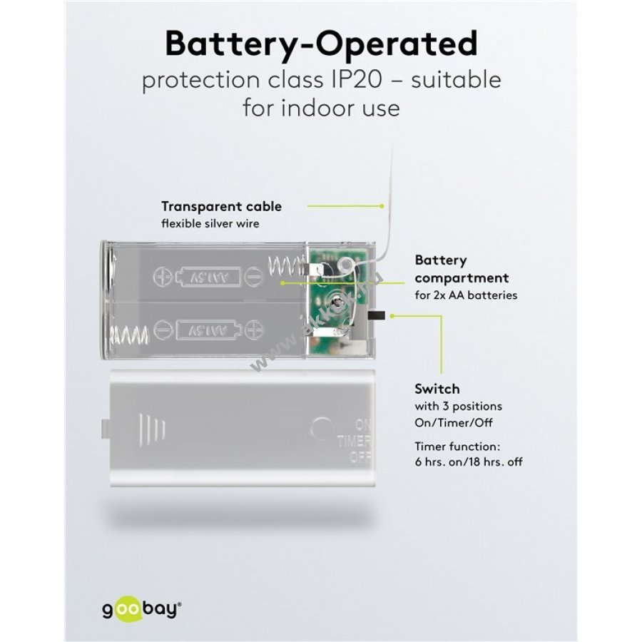 A LED fényfüzér időzítő funkcióval rendelkezik: 6 óra bekapcsolva 18 óra kikapcsolva.