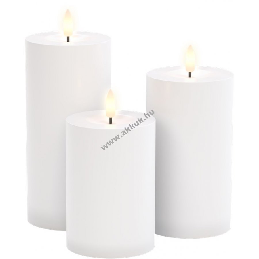 A fehér LED-es gyertyalámpák valósághűen pislákoló hatásukkal bármilyen belső stílusban - otthon, a kertben, az erkélyen vagy a teraszon - szemet gyönyörködtetőek. A meleg fehér fény hangulatos légkört teremt, és minden alkalomra tökéletes asztali dekoráció, partidísz, karácsonyi dekoráció és LED-es dekoráció A gyertyakészlet praktikus vezérlése 10 gombos infravörös távirányítóval: Be/Ki, időzítő, 2 fénymód, 4 fokozatú fényerőszabályzó, hatótávolság kb. 6 m Időzítő funkcióval: 2, 4, 6 vagy 8 órás világítási intervallum, automatikus ismétlés 24 órás ciklusokban 2 világítási mód: romantikus gyertyafény vagy állandó fény 4 fényerősséggel az egyéni hangulat érdekében A készlet 3 különböző méretű (7,1 x 10 / 12,5 / 15 cm) láng nélküli LED-gyertyából áll, matt műanyag felülettel és valósághűnek tűnő fekete gyertyafonallal. Elemmel működik - gyertyák: 2db AA egyenként (6 db / készlet, nem tartozék), távirányító: 1x CR2025 (tartozék), az elemtartó vízálló, kültéri használatra alkalmas