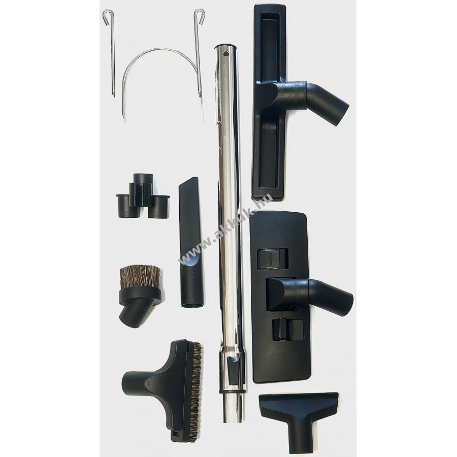 2db széles padlófúvóka, 1db résfúvóka, 2db kárpitos fúvóka, 1db kerek fúvóka, 1db teleszkópos rúd, meghosszabbítható, 1db fali tömlő tartó