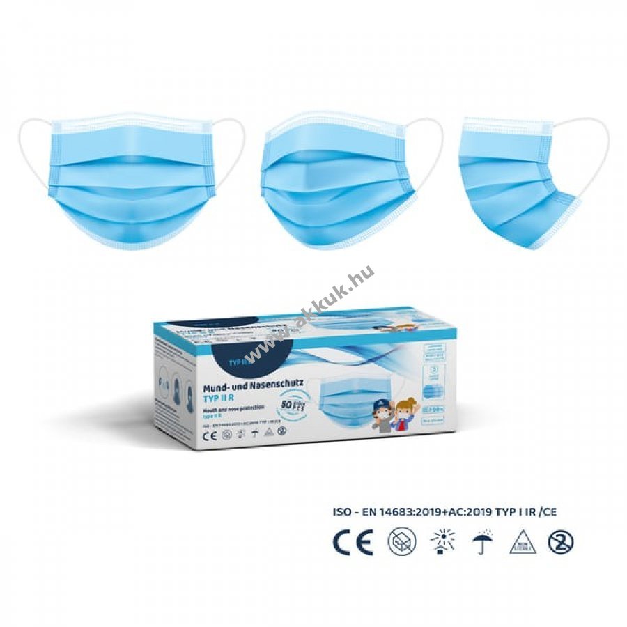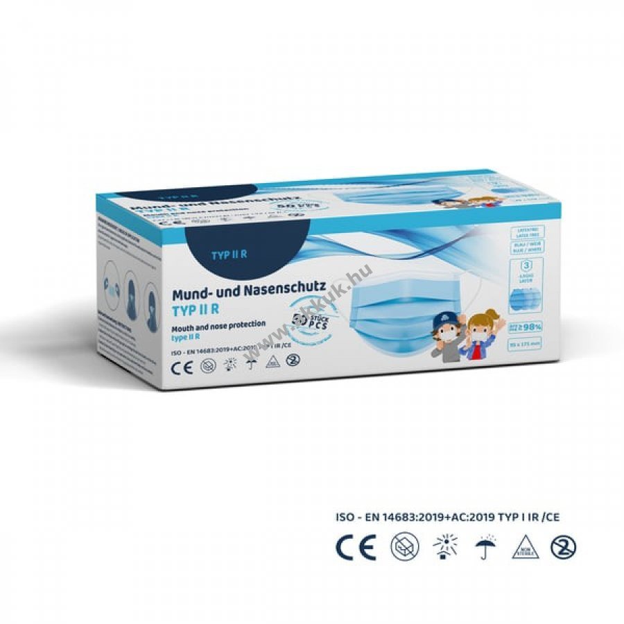 Eldobható orvosi arcmaszk IIR típus (IIR = folyadékálló) Az EN 14683:2019 + AC:2019 szabvány szerint tanúsítva. 3 rétegű eldobható maszk, II R típusú szűrő, legjobb szűrőosztály (BFE >= 98% a DIN EN 14683:2019-10 szerint). Fokozott ellenállás a folyadékokkal és aeroszolokkal szemben Biztonságos: Tanúsítvány, CE, Hatékony védelem a 3 rétegű gyapjúnak köszönhetően, alkalmas az egészségügyben és az orvosi ellátásban, valamint az élelmiszeriparban, beleértve a vendéglátóipart is. Bőrbarát: Kiváló minőségű, bőrbarát fleece anyagból készült, puha, kényelmes és lélegző. Kényelmes viselet: Állítható orr-rész, hogy a maszk a viselője arcformájához igazodjon, szemüvegviselők számára is alkalmas. Kisebb méret: ideális gyermekek, tinédzserek és kis fejformájú felnőttek számára. Méret: kb. 14,5 cm x 8,5 cm