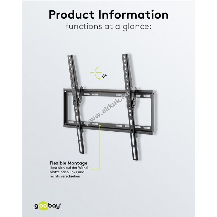 A dönthető TV-fali tartó minden 32-55 hüvelyk (81-140 cm) méretű, legfeljebb 35 kg-os TV-hez. 0-tól 8 fokig dönthető. A szupervékony kialakítás mindössze 20,5 mm távolságra van a faltól, és kiegészíti az ultravékony TV-k elegáns megjelenését. Nyitott kialakítás jellemzi, amely maximalizálja a levegő áramlását az eszközökhöz, és könnyű hozzáférést biztosít az alkatrészek hátuljához. A tévé a fali lemezen balra és jobbra is mozgatható a pontos pozícionálás érdekében.