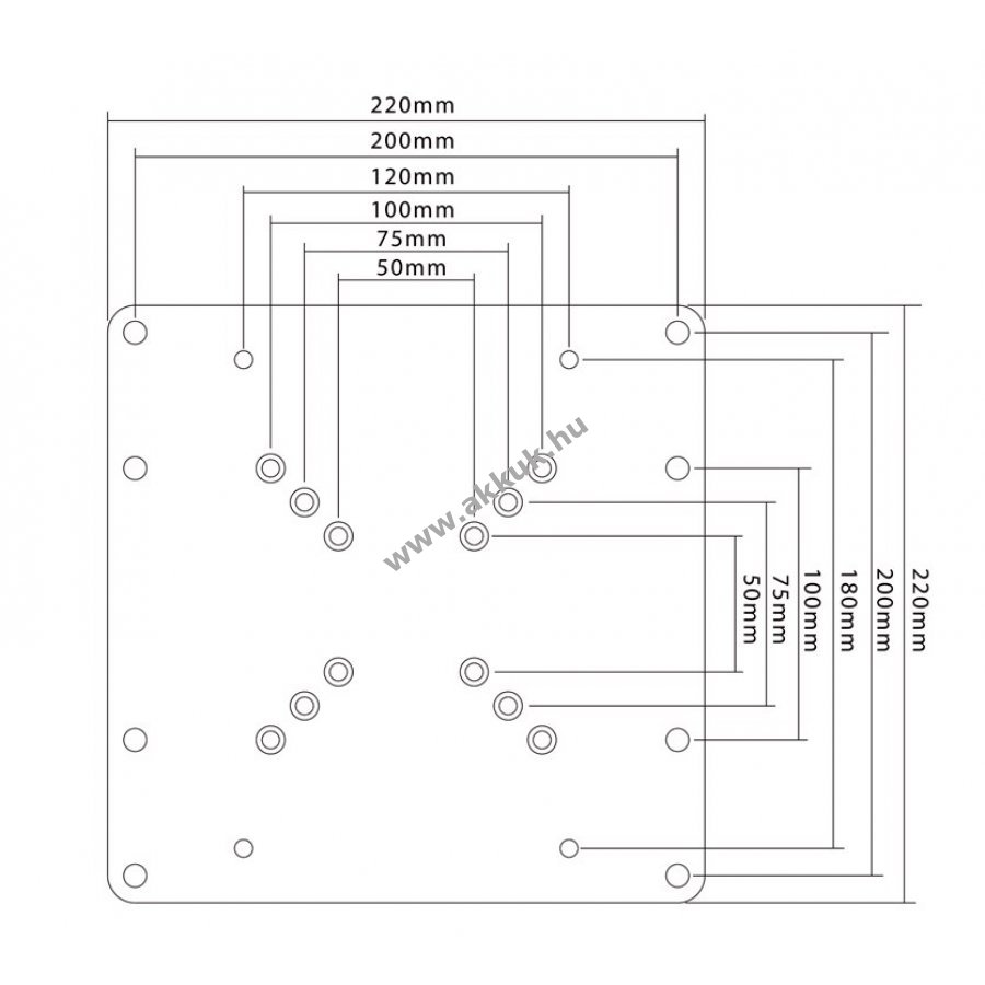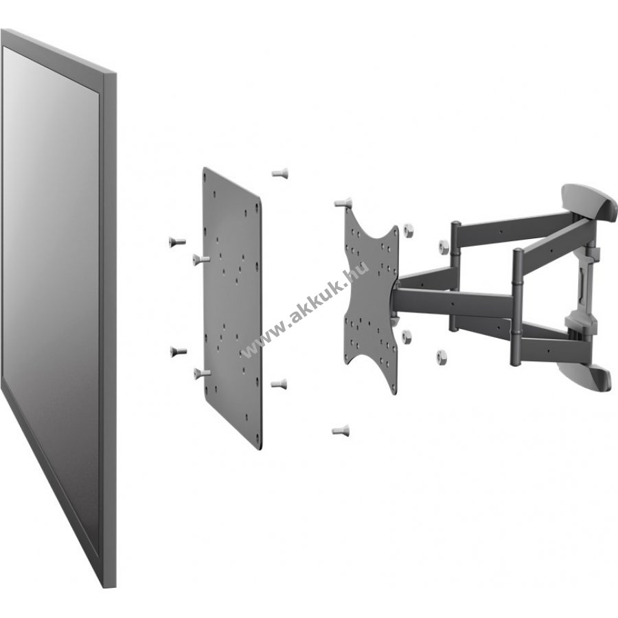 a VESA-méreteknek a fali tartó és a TV közötti, legfeljebb 200x200 mm-es mérethez való igazításához Ez a VESA-adapter lehetővé teszi, hogy a fali tartó 50 mm x 50 mm-es furattávolságát akár 200 mm x 200 mm-re növelje. A VESA adapter a TV és a fali tartó közötti furattávolságot igazítja. A maximális terhelés az adott fali tartótól függ. Az adapter kiváló minőségű porszórt fémből készül. A rögzítőanyagot (csavarok, anyák stb.) a csomag tartalmazza.