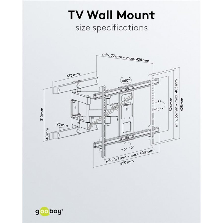 A Full Motion tartó a legtöbb 37-70 hüvelykes (94-178 cm) TV-hez 60 kg-ig.A tartó teljesen mozgatható, optimális dőlésszöget biztosít a fal távolsága akár 428 mm. A Full Motion maximális rugalmasságot tesz lehetővé. Döntheti, pásztázhatja, széthúzhatja és kiegyenlítheti, hogy a szoba bármely helyéről nézhesse a TV-t. Mindezt szerszámok nélkül. A telepítés utáni szintezés biztosítja, hogy a TV tökéletesen álljon a falon. A beépített kábelkezelő rendszer rendszere rendezi és védi a kábeleket. Egyszerű rögzítés és kompatibilis a VESA 200x200, 300x200, 300x300, 400x200, 400x300, 400x400, 600x400 szabványokkal.