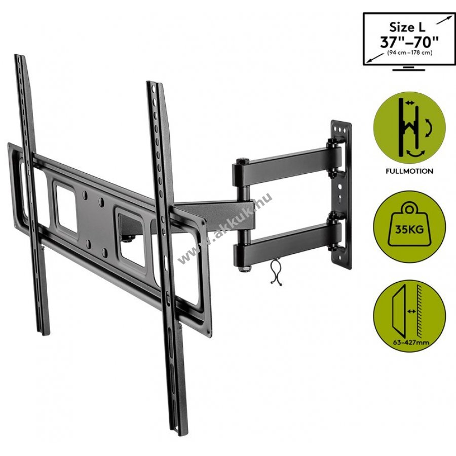 Tökéletes betekintési szög és maximális rugalmasság a teljes mobilitás révén a dőlés (+10° és -15° között fel/le) és a forgathatóság (balra/jobbra 90°) révén. A fali tartó mindössze 63 mm-es pozícióban tartja a TV-t elegánsan laposan és helytakarékosan a falon, és akár 427 mm-re is kihúzható az optimális betekintési szög elérése érdekében. A beépített kábelkezelő rendszer biztosítja a csatlakozókábelek rendjét és védelmét. Alkalmas fali tartó a legtöbb népszerű márkájú (pl. Samsung (QLED és LED is), Sony, Philips, LG) és méretű (pl. 40 hüvelyk, 43 hüvelyk, 49 hüvelyk, 50 hüvelyk, 55 hüvelyk, 58 hüvelyk, 65 hüvelyk) lapos és hajlított TV készülékhez. Egyszerű rögzítés és kompatibilis a 200 x 200 mm, 300 x 300 mm, 400 x 200 mm, 400 x 400 mm, 600 x 400 mm VESA szabványokkal.
