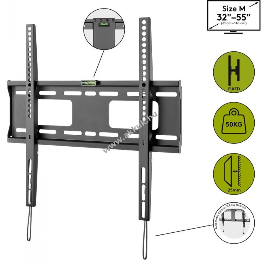 A rendkívül lapos fali tartó elegánsan laposan és helytakarékosan tartja a TV-t a falon, mindössze 25 mm-es.Automatikus bepattanás és könnyű kioldás - A tévé felakasztásakor a biztonságos bepattanást és kioldást biztosító rugós reteszeléssel ellátott rögzítő segédeszköz (nincsenek kézzel rögzítendő reteszelőcsavarok) gyerekjátékká teszi a telepítést. A beépített vízmérték biztosítja a szerelés egyszerű összehangolását. Alkalmas fali tartó a legtöbb népszerű márkájú (pl. Samsung (QLED és LED is), Sony, Philips, LG) és méretű (pl. 32 hüvelykes, 40 hüvelykes, 43 hüvelykes, 49 hüvelykes, 50 hüvelykes, 55 hüvelykes) lapos és hajlított televízióhoz. Egyszerű rögzítés és kompatibilis a 200 x 200 mm, 300 x 300 mm, 400 x 200 mm, 400 x 400 mm VESA szabványokkal.