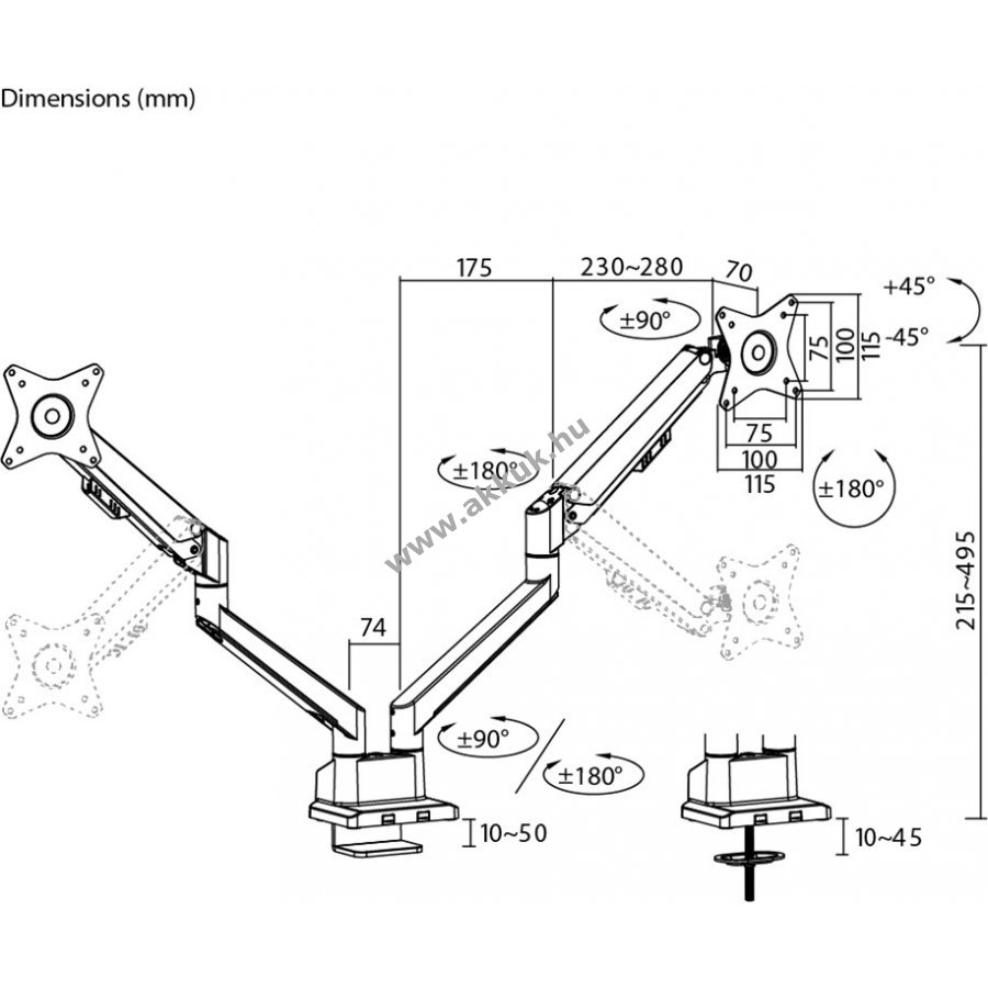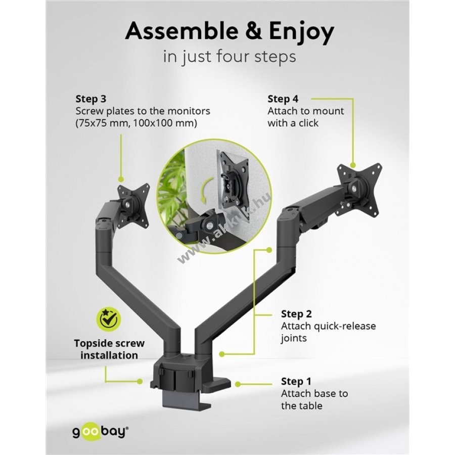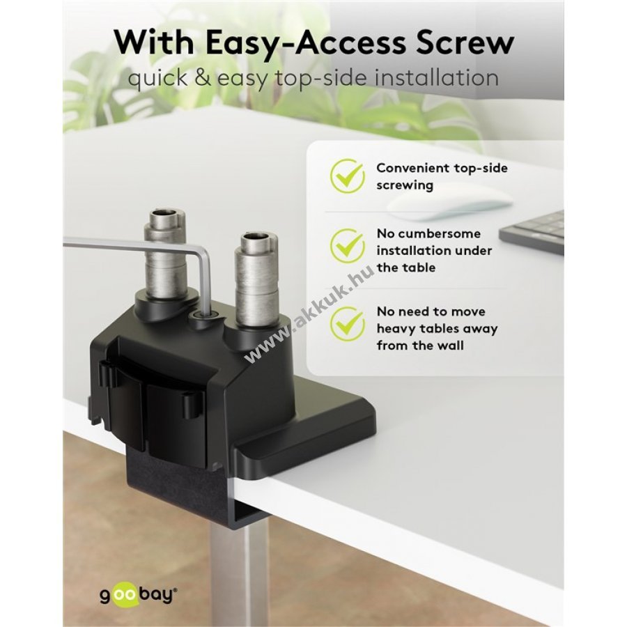 Maximum 10-50mm vastag asztallapra szerelhető fel. Vesa kompatuibilis 75mm x 75mm, 100mm x 100mm