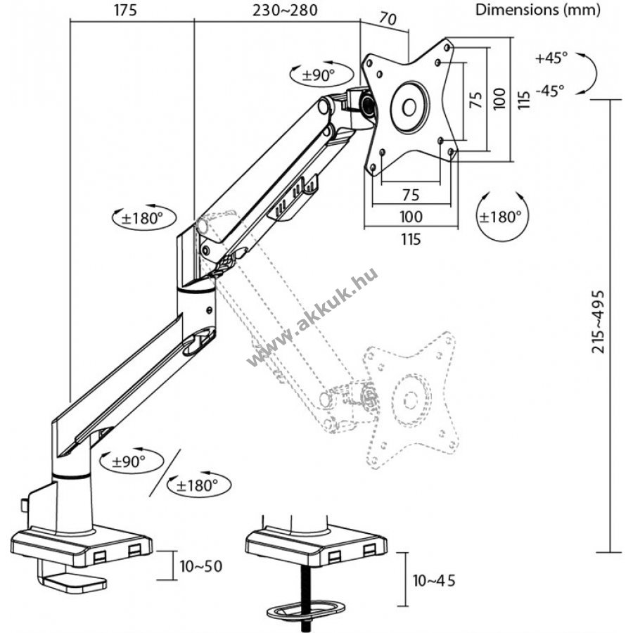 Ajánlott asztallap vastagság 10mm és 50mm között, VESA kompatibilitás 75mm x 75mm, 100mm x 100mm