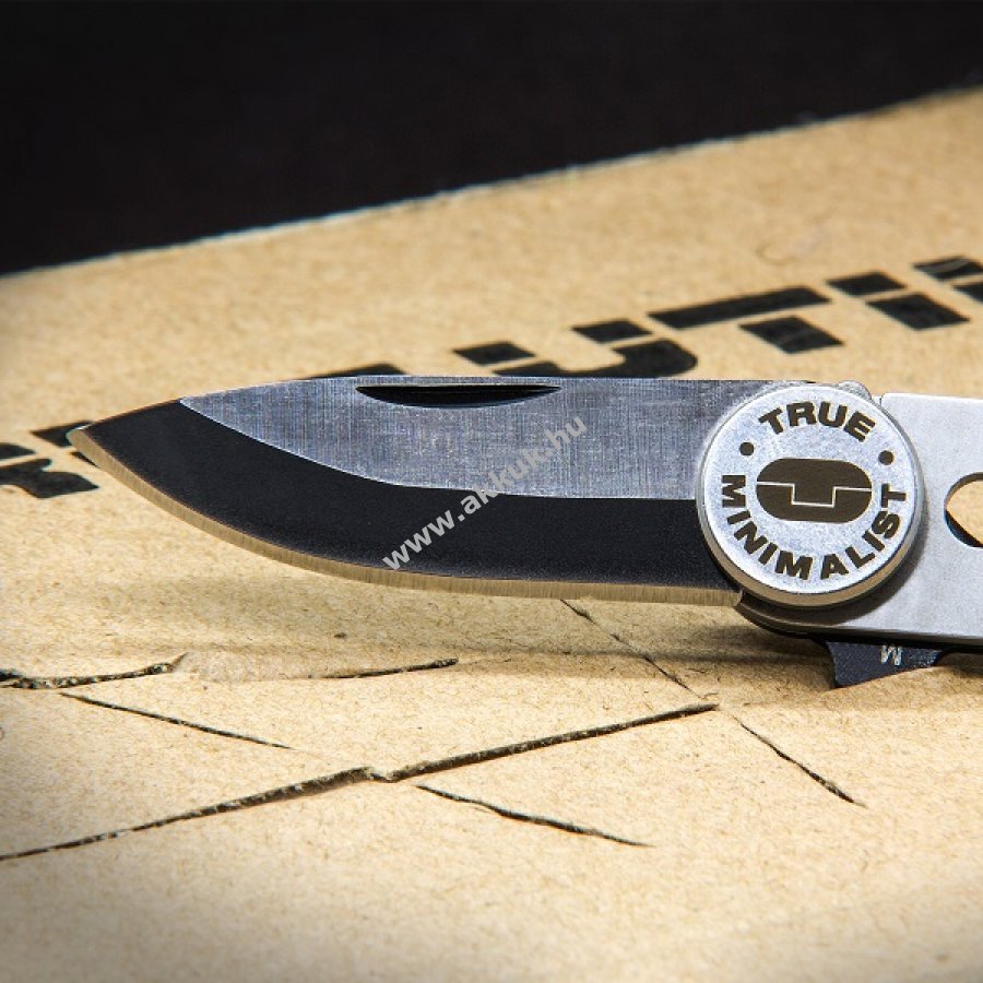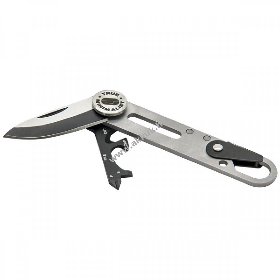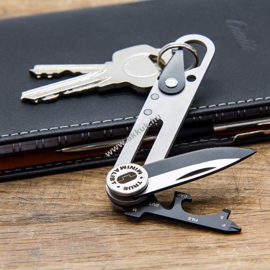 designer kés és multifunkciós szerszám karabíner, sörnyitó, kicsi/nagy laposfejű csavarhúzó, reszelő, damilvágó, fekete titánréteggel bevont, rozsdamentes acél kés könnyű, vékony és kis helyen is elfér méretek (összecsukva): 8,6 x 2 x 1,2 cm