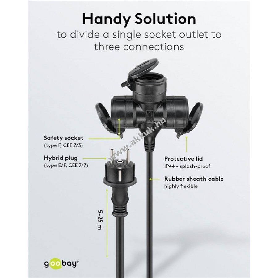 Nagy hatótávolságú hosszabbítókábel három aljzattal háztartási gépekhez beltéren és kültéren egyaránt. Gyors és biztonságos csatlakoztatást tesz lehetővé porszívózáshoz, barkácsoláshoz vagy fűnyíráshoz.